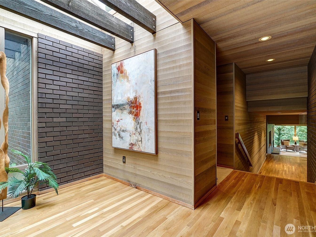 This modern entryway combines warmth and style with natural materials and contemporary design. The rich wood paneling and expertly laid hardwood flooring create an inviting atmosphere, while the striking dark brick wall adds a touch of urban sophistication. A large abstract painting infuses color and personality, enhancing the aesthetic appeal. The open layout promotes a seamless flow between spaces, making it ideal for family gatherings. Large windows invite ample natural light, offering a view of the lush surroundings. A potted plant adds a hint of greenery, completing this family-friendly space that welcomes everyone.