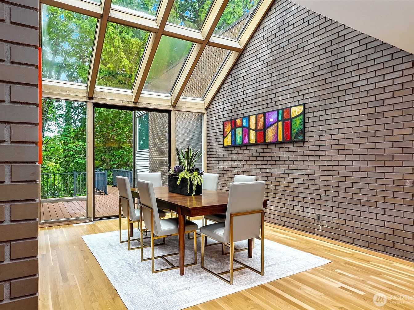 This inviting dining room features a harmonious blend of natural light and contemporary design. A stunning glass roof maximizes sunlight, illuminating the elegant wood table surrounded by sleek, modern chairs adorned with soft upholstery. The warmth of rich hardwood flooring contrasts beautifully with the textured brown brick walls, creating a cozy yet chic atmosphere. Highlighting the wall, a vibrant piece of abstract art adds a touch of color and personality. Positioned next to large glass doors, the space effortlessly connects with the outdoor deck, making it perfect for family gatherings and entertaining, all while embracing nature.