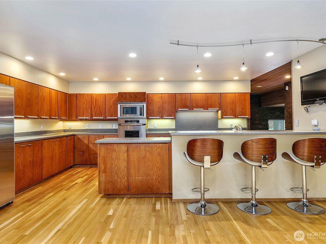 Featuring sleek lines and a contemporary vibe, this kitchen is designed for both functionality and style. The rich wooden cabinetry complements the clean granite countertops, providing ample storage space while adding warmth to the area. Stainless steel appliances, strategically placed, enhance the modern appeal, while the open layout creates a seamless flow between cooking and entertaining. Elegant, minimalist bar stools invite casual gatherings around the island, and under-cabinet lighting illuminates the workspace brilliantly. The combination of natural wood flooring and neutral wall tones promotes a cozy yet sophisticated atmosphere, ideal for family interactions and culinary creativity.