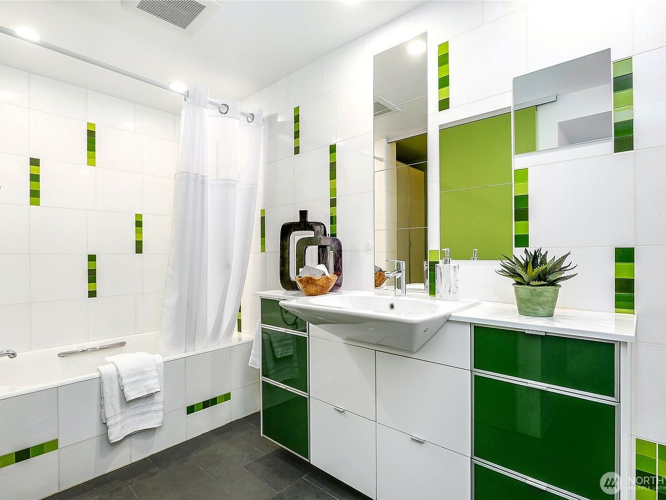 This modern bathroom combines functionality with a refreshing aesthetic. The sleek layout features a clean white interior accented by vibrant green tile strips that inject a playful yet sophisticated charm. A spacious bathtub invites relaxation, while the large vanity area showcases a stylish sink and ample storage beneath. Contemporary mirrors enhance the sense of space and light, complemented by chrome fixtures that add a touch of elegance. Family-friendly elements, like a curving shower curtain, ensure safety and comfort. Potted greenery brings life into the room, harmonizing with the color palette and creating a rejuvenating sanctuary for all.