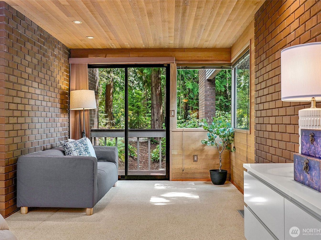 A serene living area merges modern design with natural beauty, highlighted by rich brown brick walls and a warm wood ceiling. The soft, gray sofa invites relaxation, complemented by decorative pillows that add a touch of personality. Spacious windows frame picturesque views of the surrounding greenery, seamlessly connecting indoors with the outdoors. A stylish floor lamp illuminates the space, creating a cozy ambiance. Light beige carpeting enhances comfort and warmth, while a sleek white dresser adds a contemporary element. This family-friendly environment encourages connection, relaxation, and appreciating the tranquility of nature just outside.