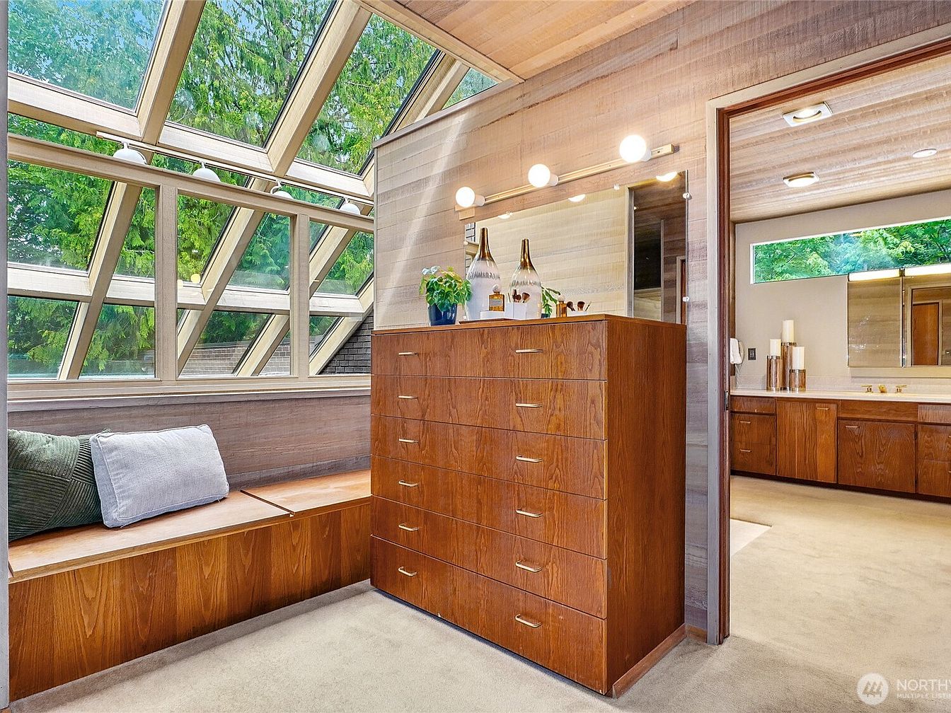 This modern bathroom seamlessly combines functionality with contemporary design. The inviting layout features a spacious vanity area equipped with sleek, wooden cabinetry and soft, ambient lighting that enhances the serene atmosphere. Large, triangular windows flood the space with natural light, showcasing the lush greenery outside, and providing an organic touch. A comfortable bench seating extends along one wall, perfect for relaxation or a quick outfit change. The neutral color palette, accented with natural wood tones, creates a warm, inviting ambiance, while the tasteful decor elements keep the space feeling modern and sophisticated, ideal for a family-friendly retreat.