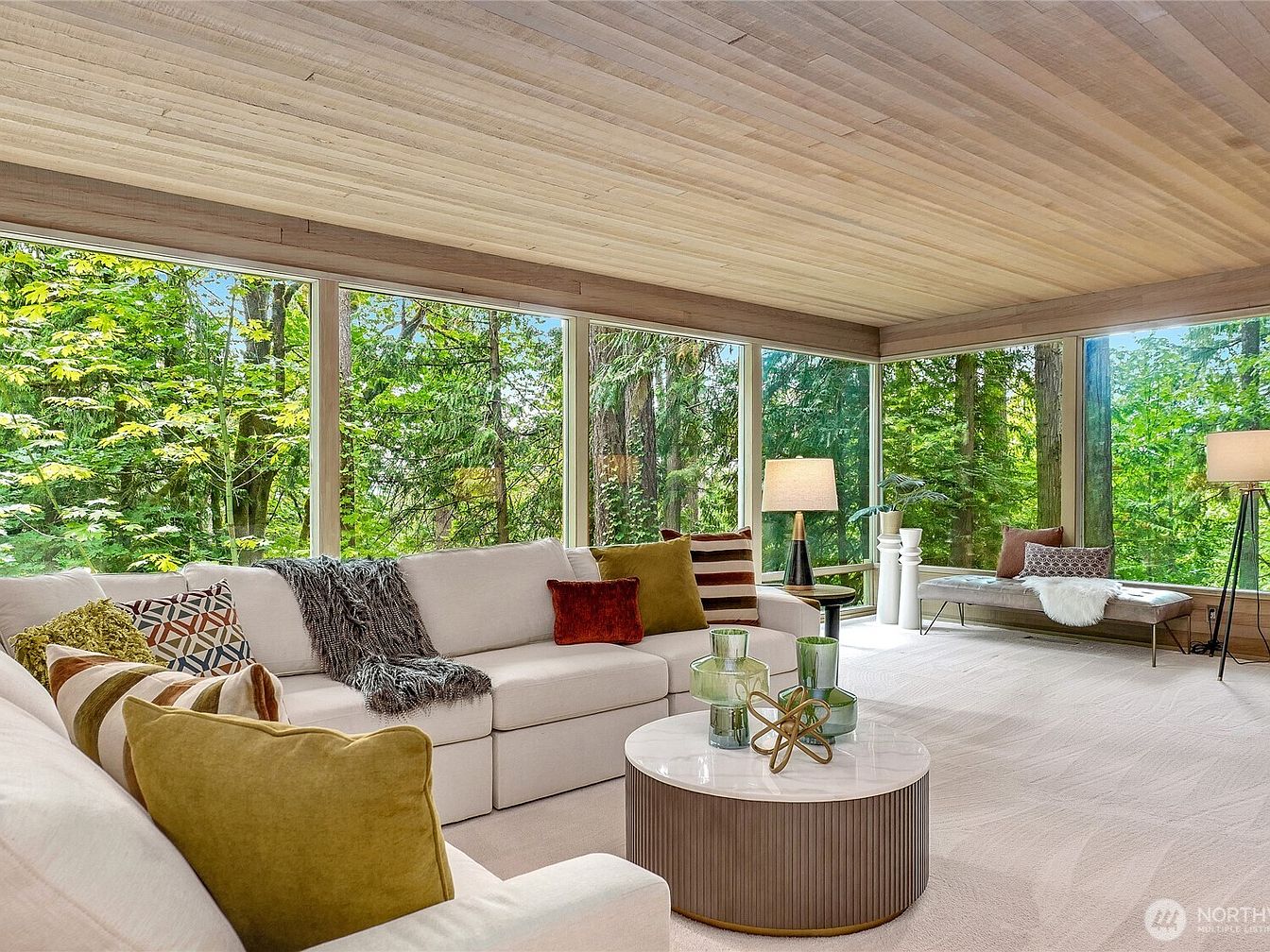 Nestled in an inviting layout, the living room seamlessly blends with nature through expansive windows that provide a stunning view of lush greenery. The space features a comfortable sectional sofa, accentuated by a mix of textured and colorful cushions that evoke warmth and vibrancy. A sleek coffee table acts as a focal point, complemented by decorative glass accents. Natural wood paneling on the ceiling adds an earthy element, while soft carpeting underfoot enhances coziness. Ambient lighting from stylish floor lamps creates a welcoming atmosphere, making it an ideal gathering spot for family and friends to enjoy.