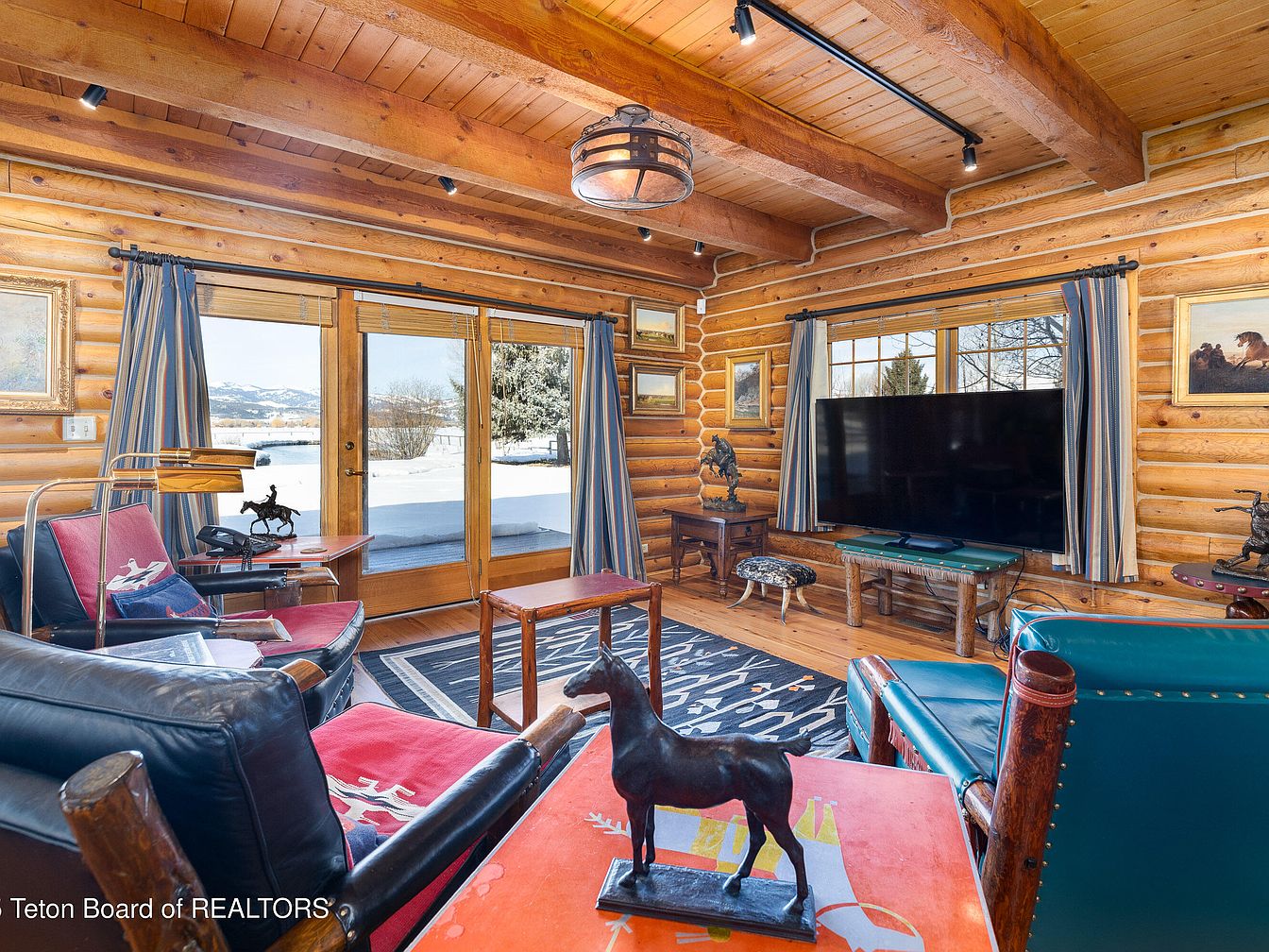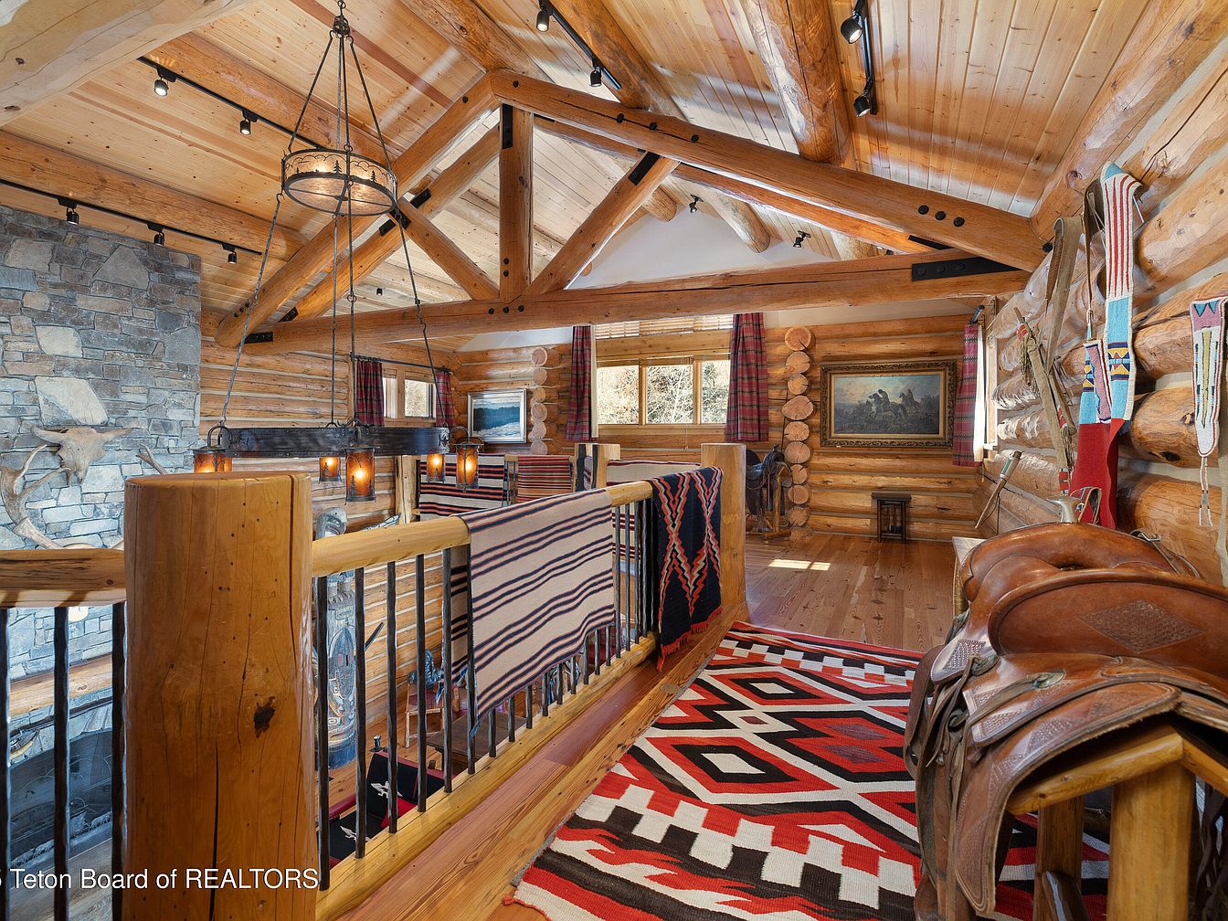 The spacious loft area blends rustic charm with comfortable living, characterized by its exposed wooden beams and log walls. A large stone fireplace adds warmth and a focal point, while the large windows invite natural light, enhancing the inviting atmosphere. Vibrant textiles cover the floor with a geometric area rug that contrasts beautifully against the warm wood tones. The hanging light fixture provides a touch of elegance, and family-friendly elements like plush seating and decorative saddles contribute to a cozy, lived-in feel. This space is ideal for gathering, reflecting a perfect blend of comfort and thoughtful design.