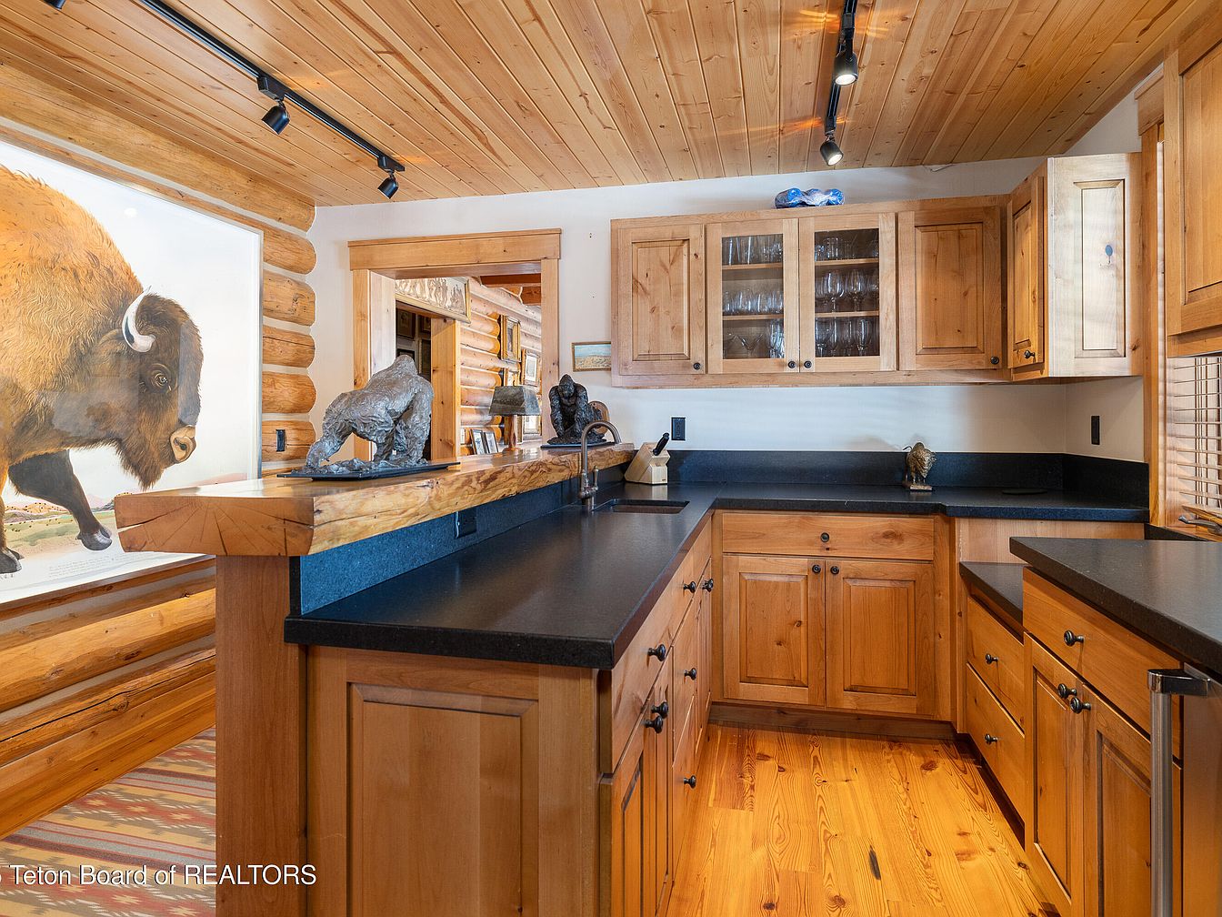 This inviting kitchen beautifully blends rustic charm with modern convenience. Warm wooden cabinetry paired with dark countertops creates a striking contrast, while the natural wood ceiling enhances the cozy atmosphere. The open layout encourages family interaction, making it perfect for both cooking and gathering. Unique decor items, including sculptures and artwork, add personality to the space, while ample storage keeps essentials organized. A large window allows natural light to stream in, illuminating the warm tones of the wood and creating an airy feel. Thoughtful touches like sturdy work surfaces and decorative accents make this kitchen both functional and aesthetically pleasing.