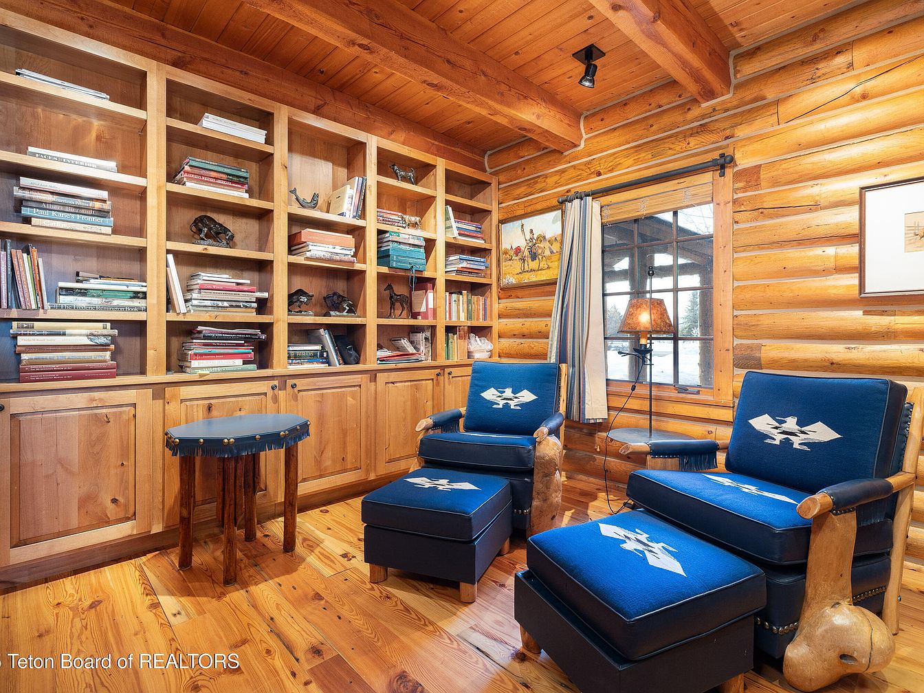 This inviting reading nook features rustic log walls that exude charm and warmth, complemented by expansive wooden shelves filled with an array of books and decorative art pieces. Comfortable blue upholstered chairs with striking white motifs invite relaxation, while a uniquely styled wooden side table adds character. The rich, honey-toned wood flooring enhances the natural aesthetic, and a soft lampshade casts a gentle glow, perfect for evening reading. Large windows allow natural light to flood the space, creating an airy feel while offering views of the outdoors. This nook is designed for family gatherings, fostering comfort and connection.