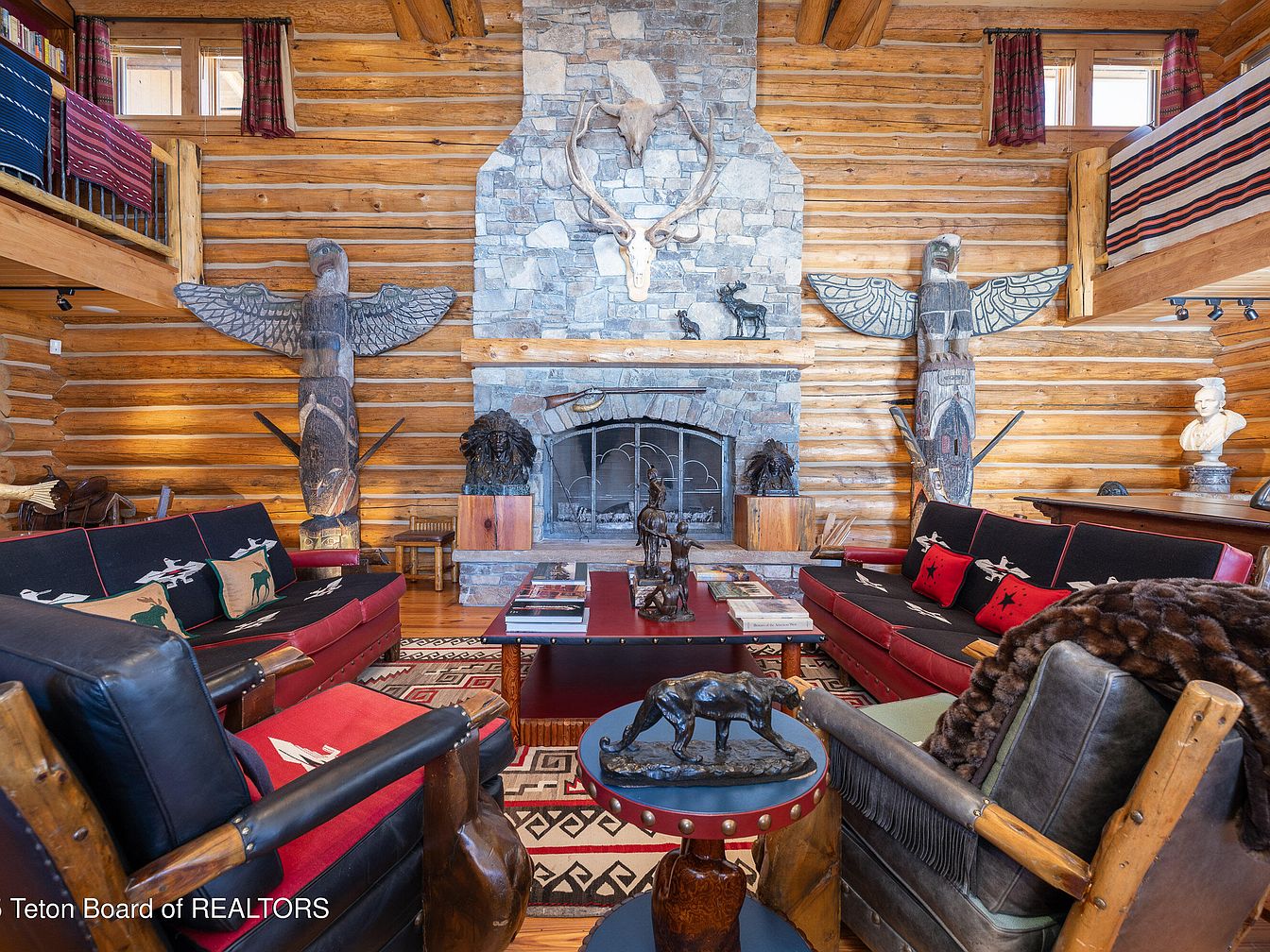 This spacious great room features a captivating blend of rustic charm and modern comfort, characterized by its impressive log construction and high, timbered ceilings. Natural light floods in through large windows, accentuating the warm wood tones and intricate details. The layout includes a cozy seating area with rich red and black upholstery, complemented by artistic accents and Native American-inspired rugs. A wooden dining table invites gatherings, while a spiral staircase leads to a second-floor balcony, adding vertical interest. Family-friendly features like ample seating and inviting ambiance create a welcoming space for relaxation and connection.