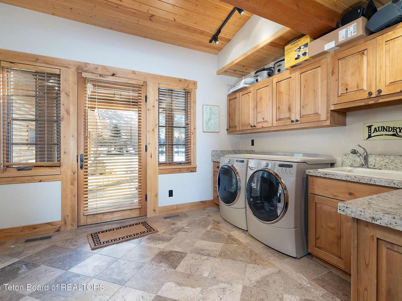 This inviting laundry room combines functionality with a warm aesthetic. It features double units of modern, front-loading washers and dryers, flanked by elegant wooden cabinets that provide ample storage. The stone-tiled floor enhances the rustic charm, while the large windows, adorned with wooden blinds, allow natural light to flood in, creating a bright atmosphere. A cozy door leads to the outside, perfect for easy access. The countertops are crafted from speckled granite, offering durability and style, while the decorative ‘Laundry’ sign adds a playful touch. Overall, this space is designed for both practicality and comfort.