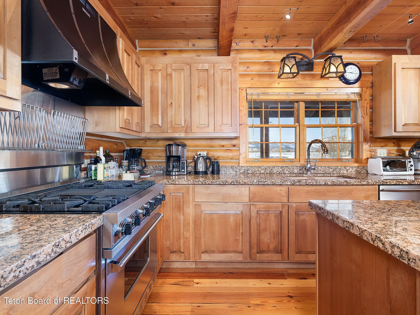 This rustic kitchen features warm wood cabinetry, showcasing rich oak tones that create an inviting and cozy atmosphere. The spacious granite countertops provide ample workspace, complemented by sleek stainless steel appliances for a modern touch. A six-burner gas stove stands out as a centerpiece, ideal for family gatherings and culinary adventures. The exposed wooden beams on the ceiling add character and charm, blending traditional craftsmanship with functionality. Large windows frame picturesque outdoor views, while contemporary lighting fixtures enhance the space’s warmth. This family-friendly kitchen is designed for both cooking and creating lasting memories together.
