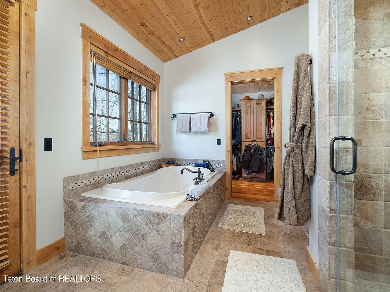 This elegant bathroom showcases a blend of rustic charm and modern comfort, featuring high ceilings adorned with rich wooden beams that create a warm ambiance. The spacious layout includes a luxurious soaking tub surrounded by inviting natural stone tile, providing a serene escape. Large windows allow abundant natural light, accentuated by stylish wooden frames that bring the outdoors in. Thoughtfully placed plush rugs enhance comfort underfoot, while careful architectural details, like the custom cabinetry and sleek fixtures, elevate the overall design. Family-friendly features include a convenient shower and ample storage, ensuring practicality meets aesthetics in this tranquil space.