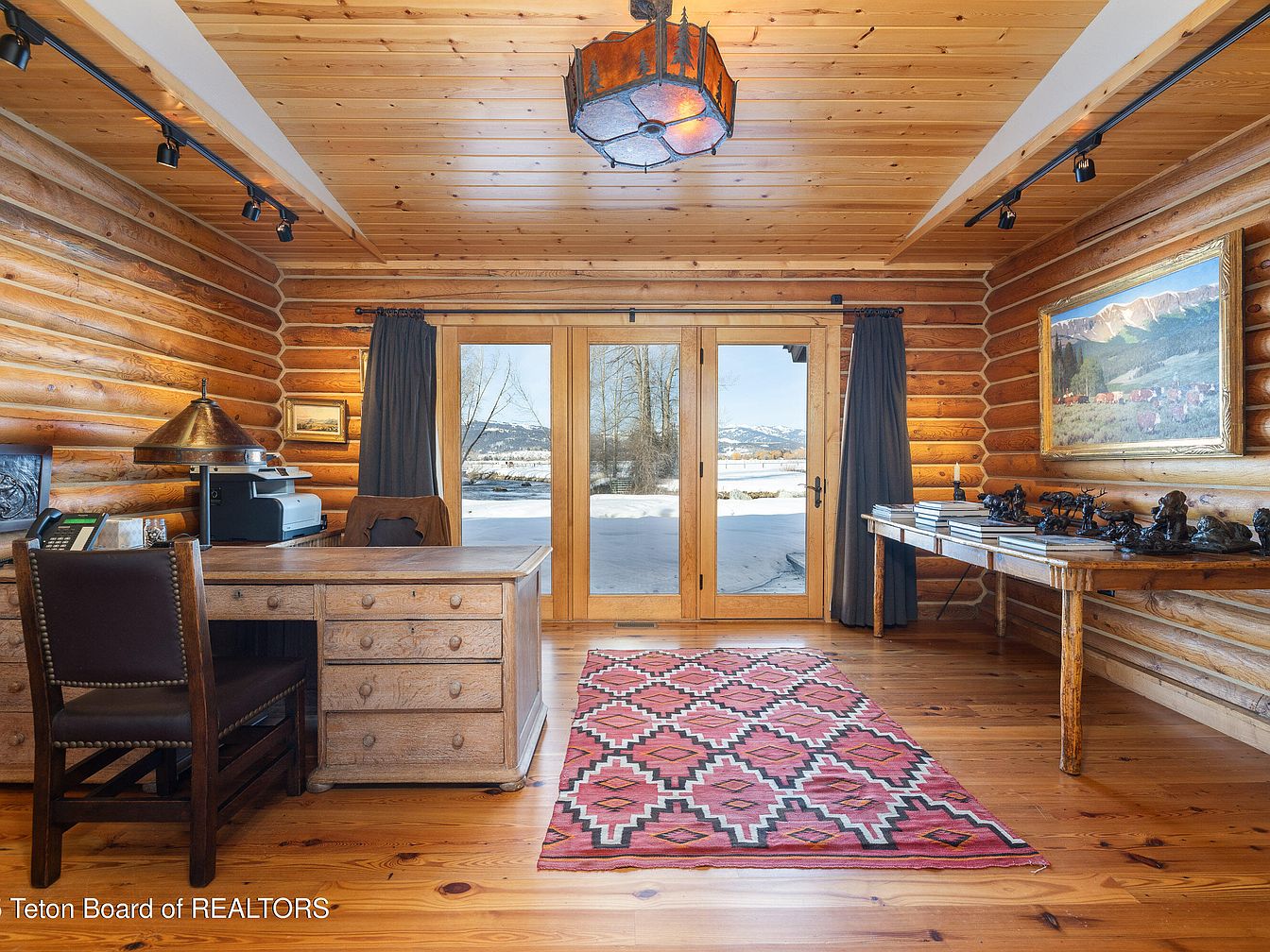 This inviting home office features stunning log cabin aesthetics, showcasing warm wood tones and natural textures. The spacious layout is designed for productivity, highlighted by a rustic wooden desk paired with a comfortable chair, perfect for extended work hours. Large glass doors invite natural light, framing picturesque views of the outdoors. A vibrant area rug adds a pop of color and comfort underfoot, while contemporary lighting enhances the cozy atmosphere. Decor elements include tasteful artwork and sculptures, contributing to the room’s character, making it a perfect blend of functionality and warmth, ideal for family use.