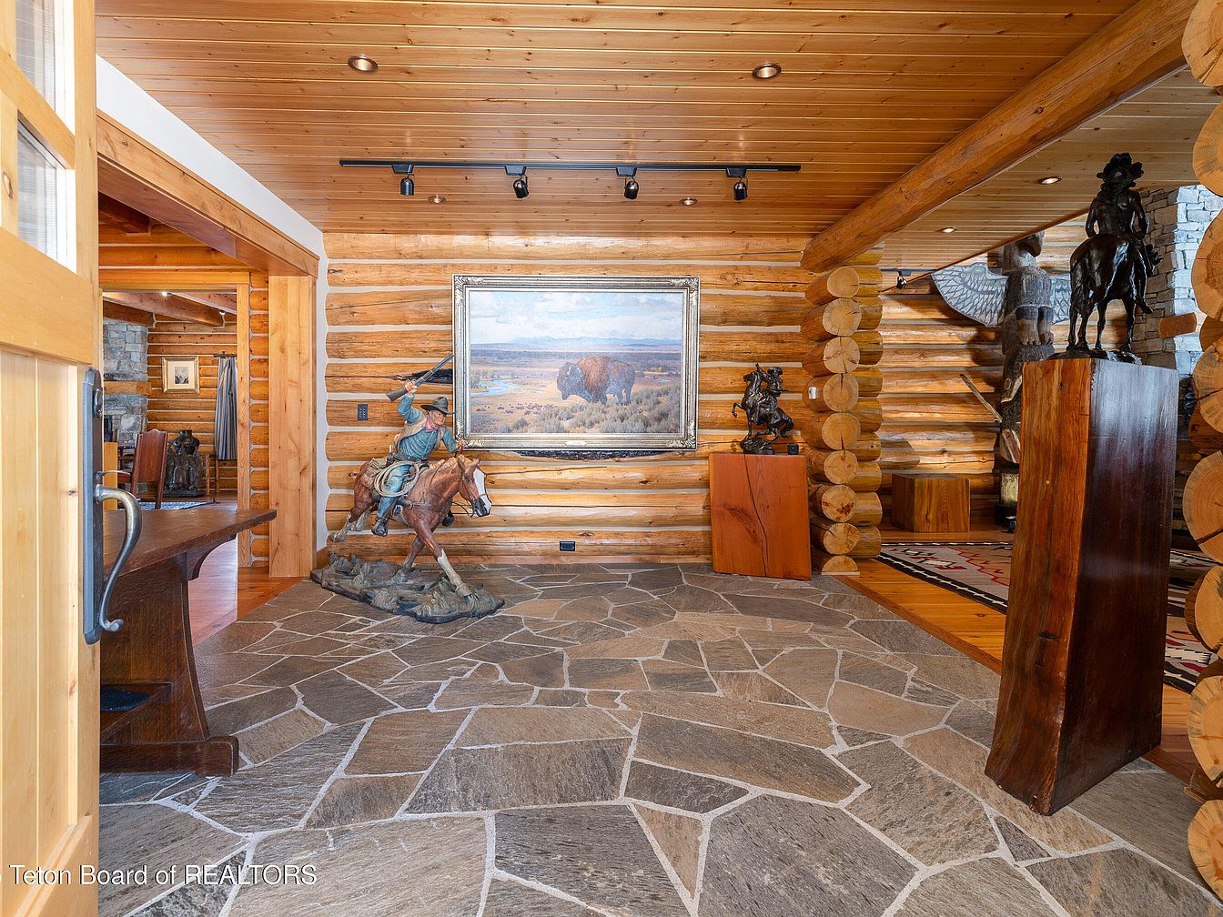 Nestled in a rustic retreat, this entryway exudes warmth and character with its elegant log construction and striking natural stone flooring. A stunning mural-style artwork of a cowboy on horseback gracefully complements the space, inviting a sense of Western heritage. The rich wooden tones, accentuated by strategically placed overhead lighting, enhance the inviting atmosphere. Bronze sculptures add a touch of artistry, reflecting craftsmanship while maintaining a harmonious balance with the organic textures. Family-friendly features include ample space for gathering, while the seamless transition to the adjoining rooms fosters an open, welcoming feel, perfect for entertaining.