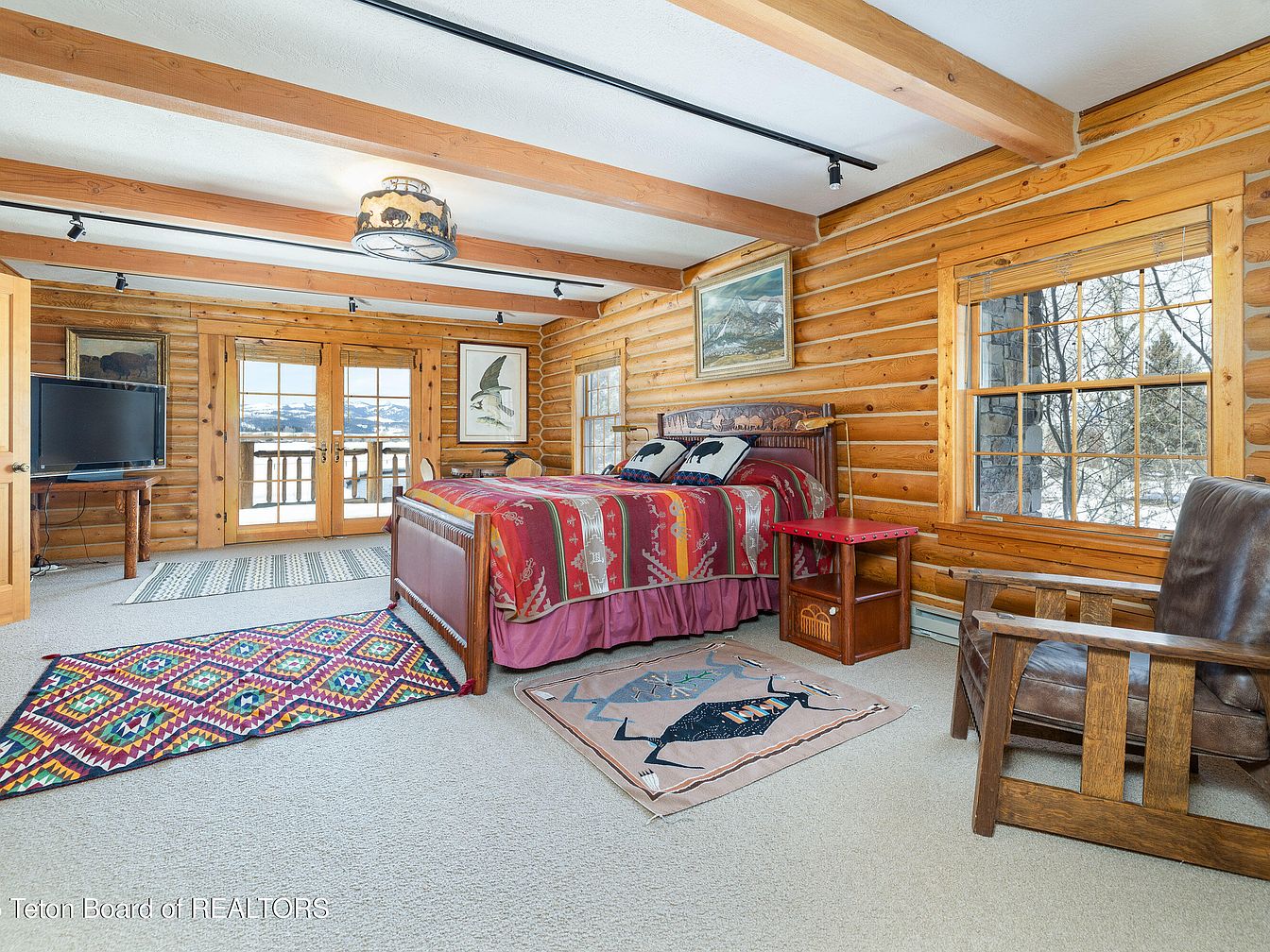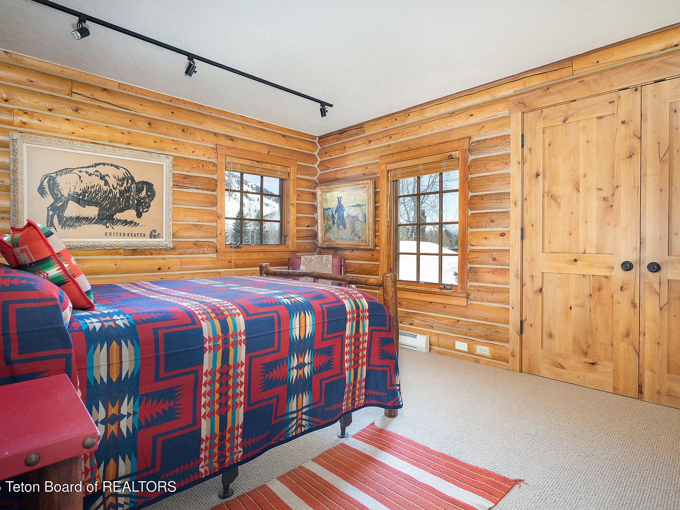 This inviting bedroom showcases charming log cabin aesthetics, with warm wooden walls that exude rustic elegance. A vibrant, patterned blanket drapes over the bed, complemented by throw pillows that add a pop of color. Thick beams above and a thoughtfully positioned track light enhance the room’s cozy atmosphere, while large windows invite natural light and showcase picturesque views. Family-friendly features include ample storage with wooden cabinets, and durable carpeting allows for comfort during playtime. The décor unifies traditional elements with modern functionality, creating a serene retreat perfect for relaxation and family gatherings.