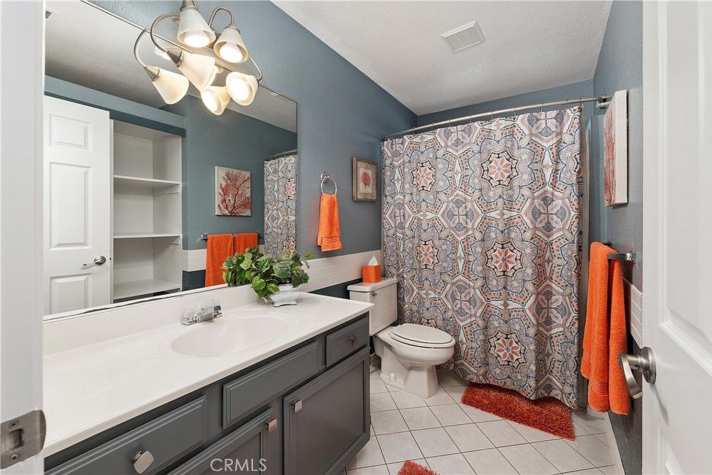This modern bathroom features a well-thought-out layout with dual sinks, providing convenience for families. The dark gray cabinetry contrasts beautifully with the pristine white countertops, offering a stylish yet functional space. A vibrant shower curtain with intricate patterns adds a playful touch, complemented by bright orange accents like hand towels and rugs. The cool blue walls create a serene atmosphere, while ample storage is available through built-in shelves. This space combines practicality with aesthetic appeal, making it perfect for family use while ensuring a fresh and inviting ambiance.