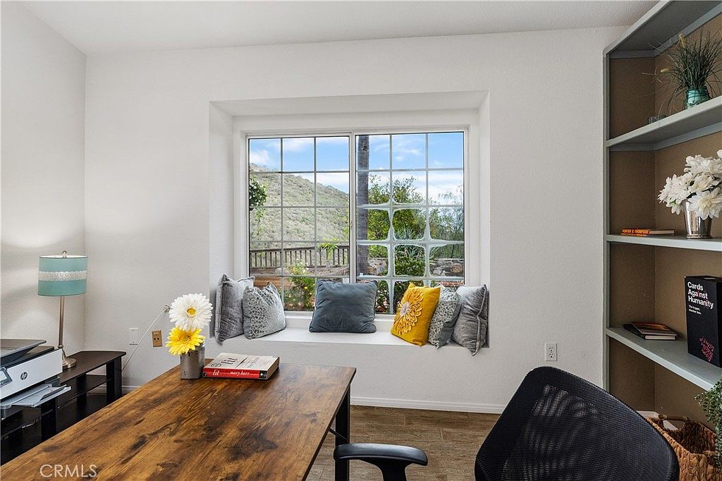 This home office blends functionality with comfort, featuring a spacious wooden desk that invites productivity against a backdrop of natural beauty. The large, inviting window showcases stunning mountain views, framed by plush cushions and decorative pillows, perfect for a cozy reading nook. A teal lamp adds a refreshing pop of color while complementing the soft white walls and warm flooring. Practical shelves are neatly arranged with books and decorative elements, providing an organized yet personalized feel. This space encourages creativity and relaxation, making it ideal for both work and leisure, designed for a family-friendly environment.