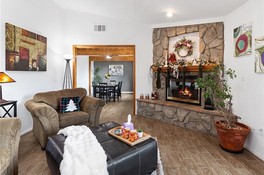 Welcoming and warm, this living room radiates comfort and style. It features a stunning stone fireplace framed by a decorative mantel, perfect for family gatherings. The inviting beige sofas, adorned with festive pillows, create a cozy seating arrangement, while the plush throw adds a touch of warmth. A contemporary lamp enhances the serene ambiance, complemented by vibrant artwork on the walls. The open layout seamlessly connects to a dining area, promoting togetherness. With earthy tones and natural wood accents, this space is perfect for casual family moments and entertaining guests, embodying both functionality and aesthetic appeal.