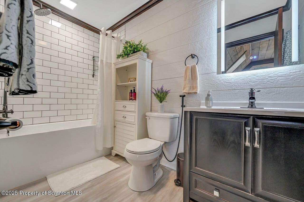 This elegant bathroom combines modern aesthetics with functional family-friendly features. A sleek white vanity with dark cabinetry provides ample storage, while the illuminated mirror enhances brightness. The classic subway tile bath surround creates a timeless look that pairs beautifully with the wood accent wall. The soft color scheme of whites and grays promotes a serene atmosphere, ideal for relaxation. Potted greenery and decorative accents add a touch of nature, emphasizing an inviting ambiance. With a thoughtfully designed layout, this space caters to both comfort and style, making it perfect for busy families or quiet retreats.