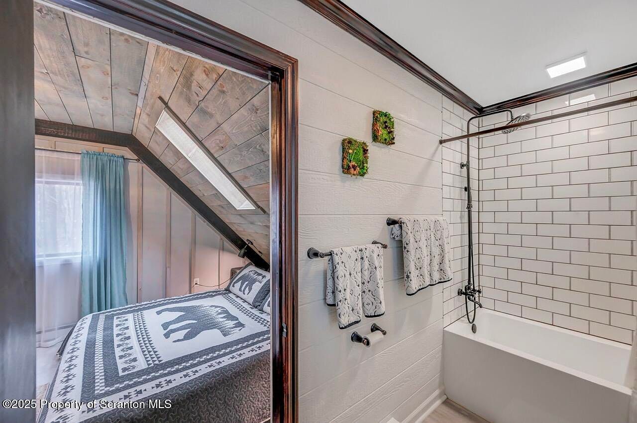 This cozy bathroom showcases a blend of rustic and modern design elements, featuring inviting wooden paneling and sleek white tiles. The sloped ceiling adds character, while the strategically placed skylight bathes the space in natural light. A bathtub with a stylish showerhead offers relaxation, complemented by elegant fixtures. Family-friendly features include plush towels hanging by the tub, ensuring comfort after a bath. A soft, patterned comforter in the adjoining bedroom continues the cohesive aesthetic, with a calming color palette of cool blues and neutrals. Decorative moss art pieces inject a touch of nature, enhancing the inviting atmosphere.
