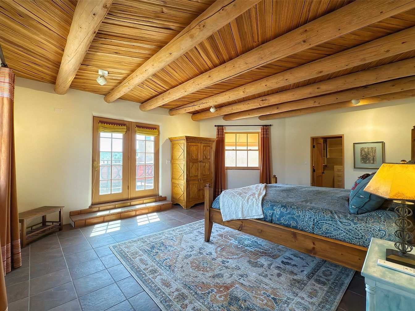 This spacious master bedroom exudes warmth and comfort with its rich wooden ceiling beams and inviting color palette. Elegant tile flooring complements the rustic ambiance, while natural light floods the room through double French doors that open to a charming outdoor space. A plush bed adorned with a tasteful blue paisley coverlet and decorative pillows adds a touch of sophistication. The carefully selected area rug introduces subtle patterns and textures, enhancing the cozy feel. Nearby, a handcrafted wardrobe offers ample storage, while simple art pieces and warm lighting fixtures round out this family-friendly retreat with a perfect balance of style and functionality.