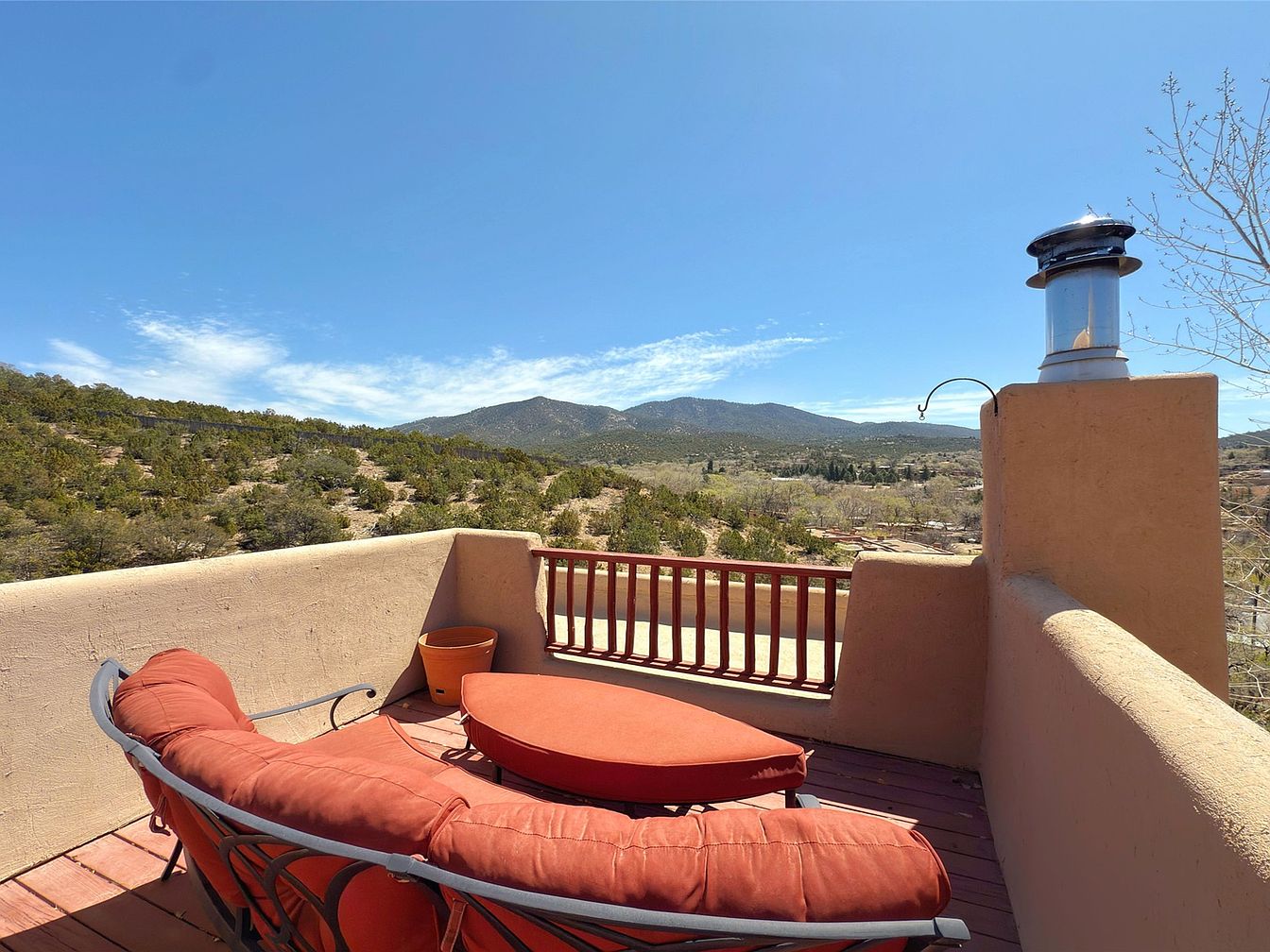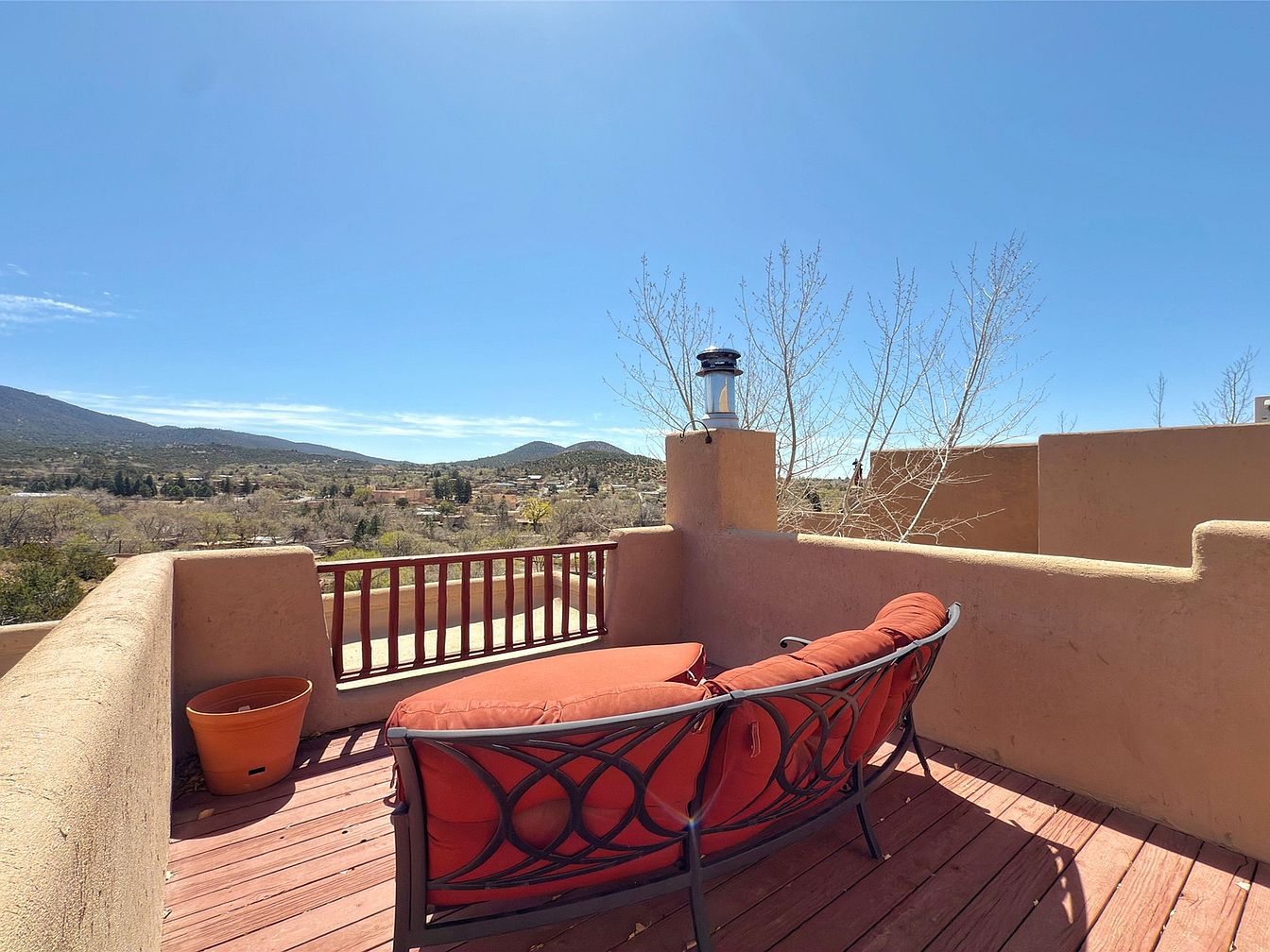 This inviting rooftop terrace features a comfortable, curved seating arrangement adorned with vibrant red cushions, perfect for relaxation. The rustic wooden deck enhances the warm and welcoming atmosphere, while the terracotta pot adds a touch of greenery, encouraging a seamless connection with nature. The surrounding adobe walls provide privacy and charm, echoing a Southwestern architectural style. Panoramic views of the picturesque landscape, accentuated by the clear blue sky, create an idyllic setting for gatherings or quiet moments. Ideal for families seeking outdoor comfort, this space invites joyful moments under the sun or starlit nights.