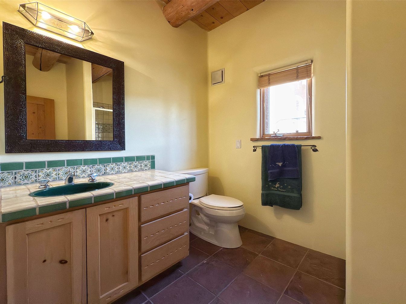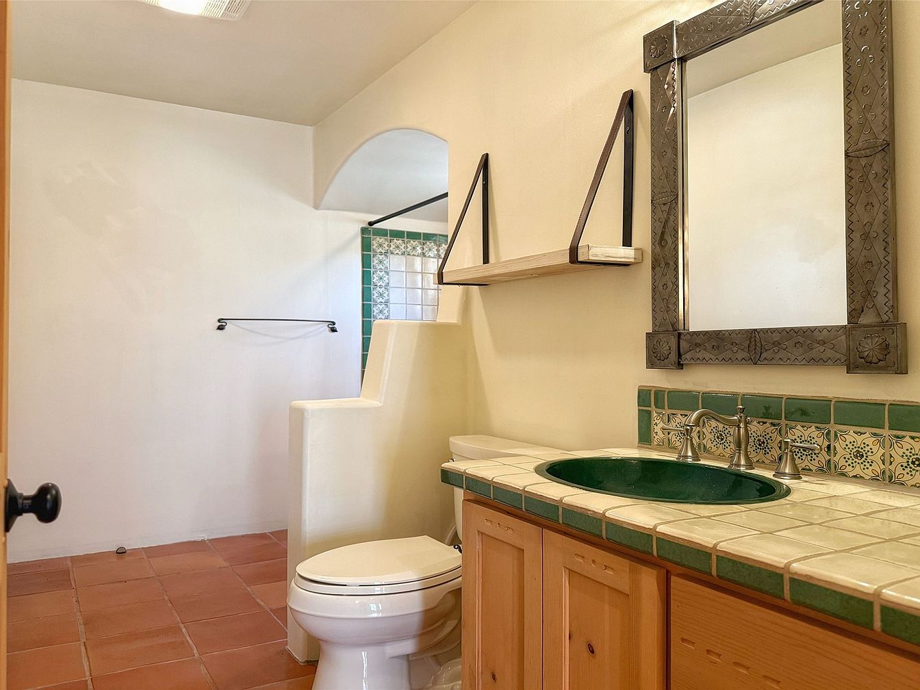 This charming bathroom features a unique design with adobe-inspired architecture and a spacious layout. The terracotta tile flooring adds warmth, while the vibrant green ceramic sink harmonizes beautifully with the handcrafted tile backsplash. A large, ornate mirror framed in metal enhances the space’s rustic elegance. Functional elements include shelving with modern leather straps for storage, making it family-friendly. The soaking tub area, partially enclosed by a low wall, provides privacy without sacrificing openness. Warm hues and natural textures create a serene atmosphere, perfect for relaxation. This bathroom beautifully merges style and practicality for everyday use.