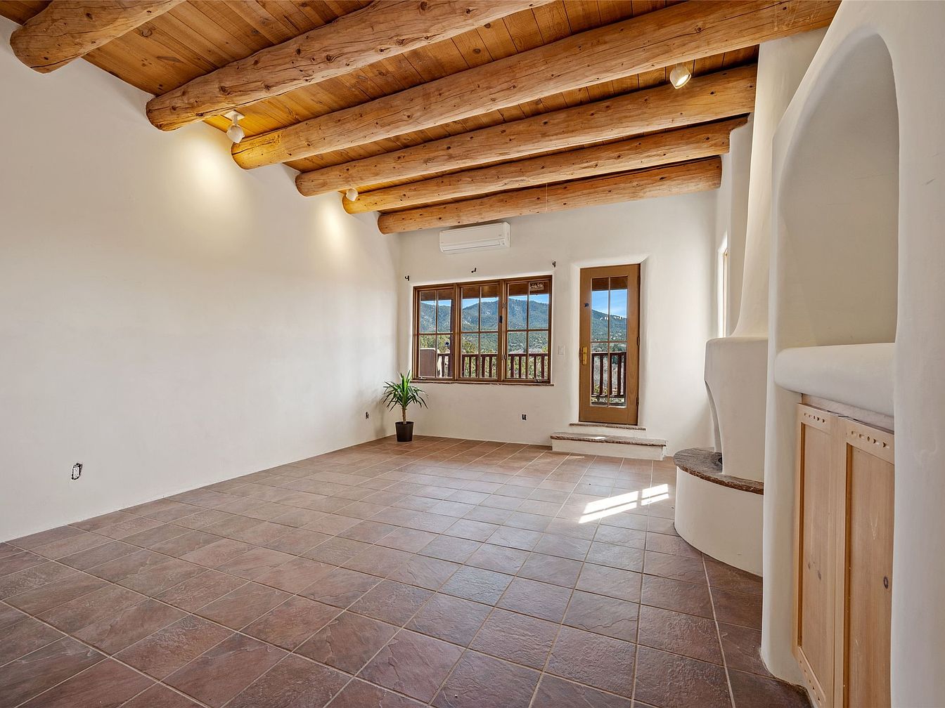 This inviting living area features soaring ceilings with rustic wooden beams, accentuating the home’s warm and welcoming atmosphere. The expansive layout is designed for family gatherings, providing a versatile space for relaxation and entertainment. Natural light floods in through large windows, showcasing breathtaking views of the surrounding landscape. The neutral color palette, complemented by rich, earthy tones in the tiled flooring, creates a soothing ambiance. Architectural details like the cozy built-in seating nook and traditional adobe accents enhance the character of the room, making it a perfect backdrop for cherished family moments.