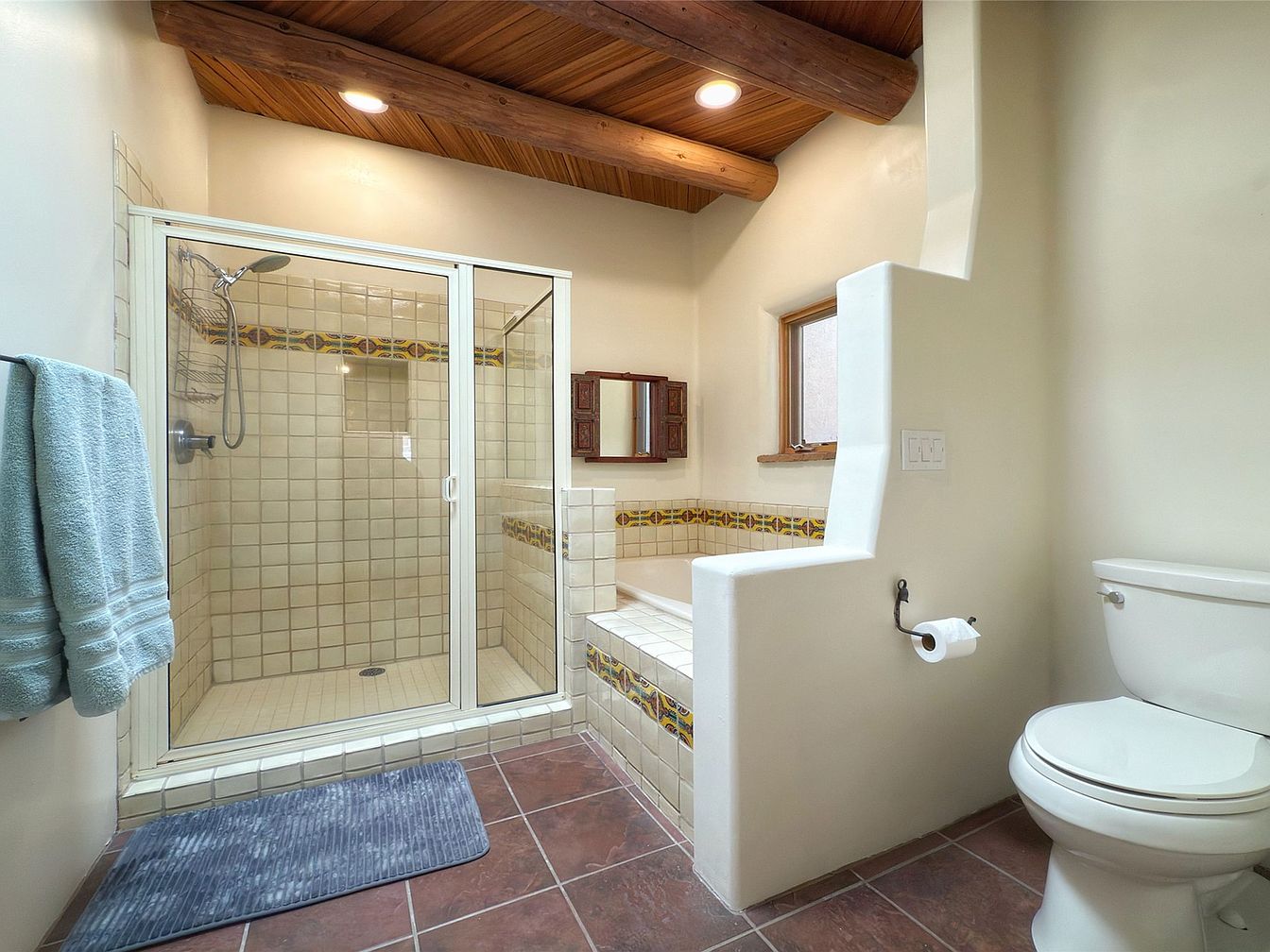 This bathroom features a harmonious blend of rustic charm and contemporary comfort. The warm wooden ceiling beams create an inviting atmosphere, while the shimmering tiled shower and soaking tub add modern luxury. A soft color scheme of cream and earthy tones enhances the soothing vibe, complemented by decorative tile accents adding character. The spacious layout allows ample room for family use, and the frosted glass shower enclosure ensures privacy. Thoughtfully positioned windows provide natural light, illuminating the space without compromising comfort. A cozy rug underfoot and plush towels enhance the welcoming feel, creating a perfect sanctuary for relaxation.
