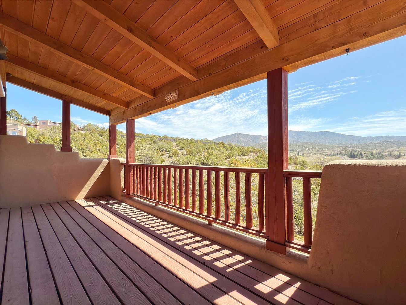 This inviting outdoor veranda showcases a spacious wooden deck framed by sturdy, rustic posts. The warm tones of the wood complement the earthy stucco walls, creating a harmonious blend with the natural landscape beyond. Large openings allow for breathtaking views of rolling hills and the sky, inviting the beauty of nature into everyday living. Family-friendly features include ample space for gatherings and a safe area for children to play. Sunlight streams through, casting playful shadows on the floor, while the overhanging roof offers shelter and comfort, enhancing this tranquil spot for relaxation and enjoyment.