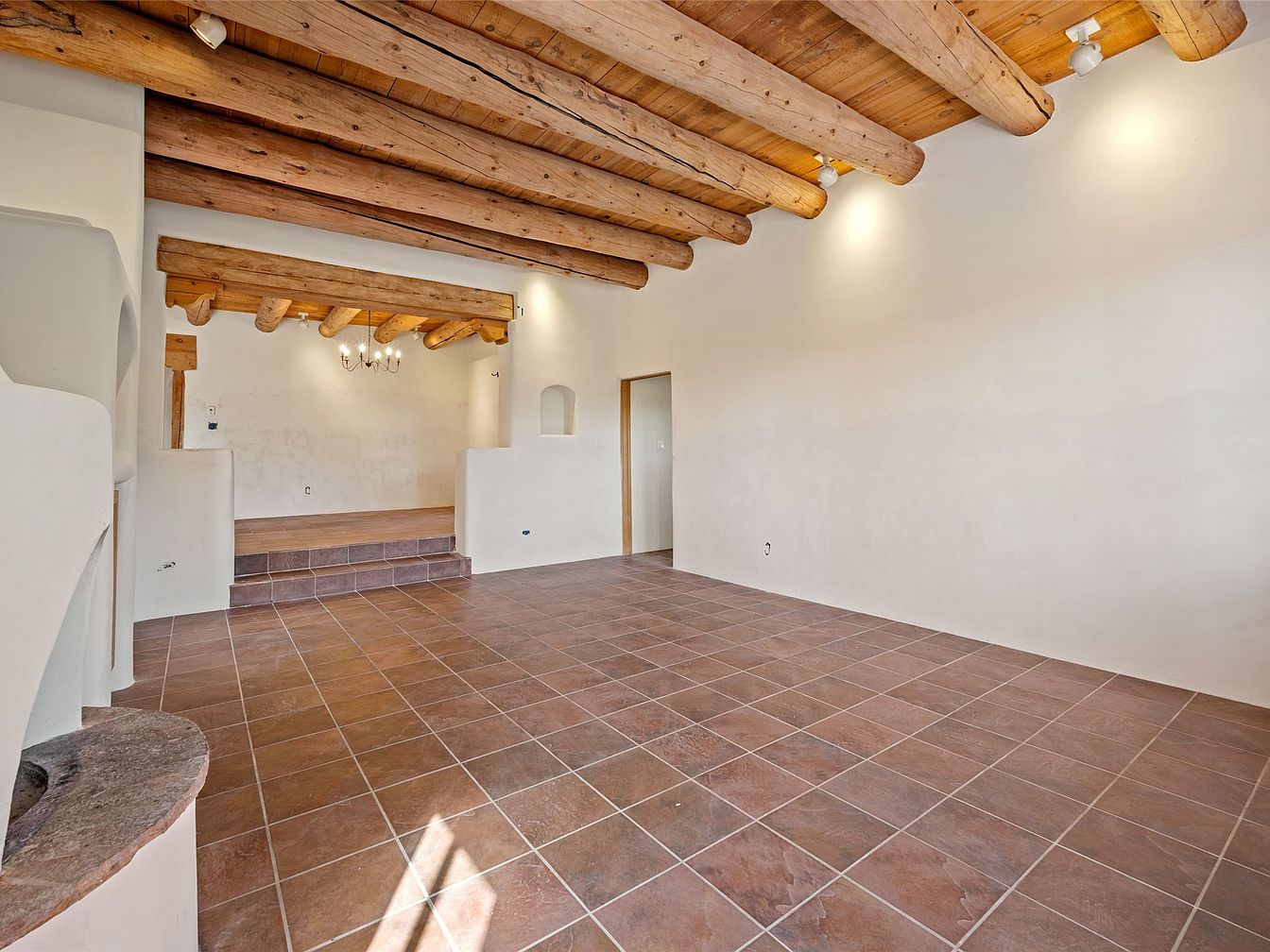 This inviting living space features natural wood ceilings with exposed beams, enhancing the rustic charm of the home. The warm earth-toned tiled flooring creates a cozy atmosphere, perfect for family gatherings. Soft, neutral walls provide a calming backdrop, allowing for personal touches in decor. With a layout that promotes flow and interaction, the room includes practical niches for art or storage. A set of steps leads to a raised area, adding visual interest and definition to the space. The soft lighting fixtures offer a warm glow, making it suitable for both lively family events and intimate evenings.