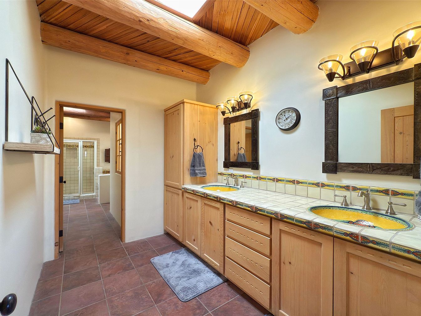 This inviting bathroom showcases a seamless blend of rustic charm and modern functionality. Natural wooden beams grace the ceiling, enhancing the airy feel, while ample natural light filters through a strategically placed skylight. The dual vanity features striking yellow ceramic sinks framed by handmade tile, reflecting a playful yet sophisticated color scheme. Warm wood cabinetry complements the earthy tones of the tiled floor, providing abundant storage solutions. Family-friendly elements include wide pathways and soft, textured rugs. With contemporary lighting fixtures flanking the mirrors, this space elegantly balances practicality and style, making it perfect for everyday use.