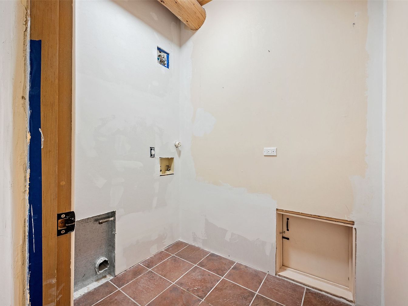 This laundry room space features a practical and functional layout, emphasizing efficiency and organization. The terracotta tile flooring provides durability and easy maintenance, while the light color palette on the walls enhances brightness, making the room feel spacious. Exposed wooden beams add a rustic charm, contrasting beautifully with the clean lines of the unfinished walls. Equipped with plumbing for a washer and dryer, there are thoughtful design features such as an integrated cabinet space that offers hidden storage, ensuring a clutter-free environment. This room is perfect for family use, facilitating everyday chores with style and ease.