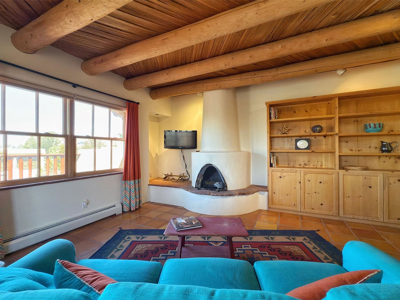 This inviting living room features a charming adobe fireplace as its focal point, creating a warm atmosphere. The room boasts a stunning wooden ceiling with exposed beams, adding character and texture. Large windows allow natural light to flood in, while vibrant orange curtains contrast beautifully with the soothing turquoise couch. The earthy color palette of terracotta tiles complements the wooden shelving, adorned with carefully selected decor pieces. Family-friendly touches include ample seating and a spacious layout, making it perfect for gatherings. The thoughtfully arranged furnishings and decorative accents bring a sense of comfort and style to this cozy retreat.