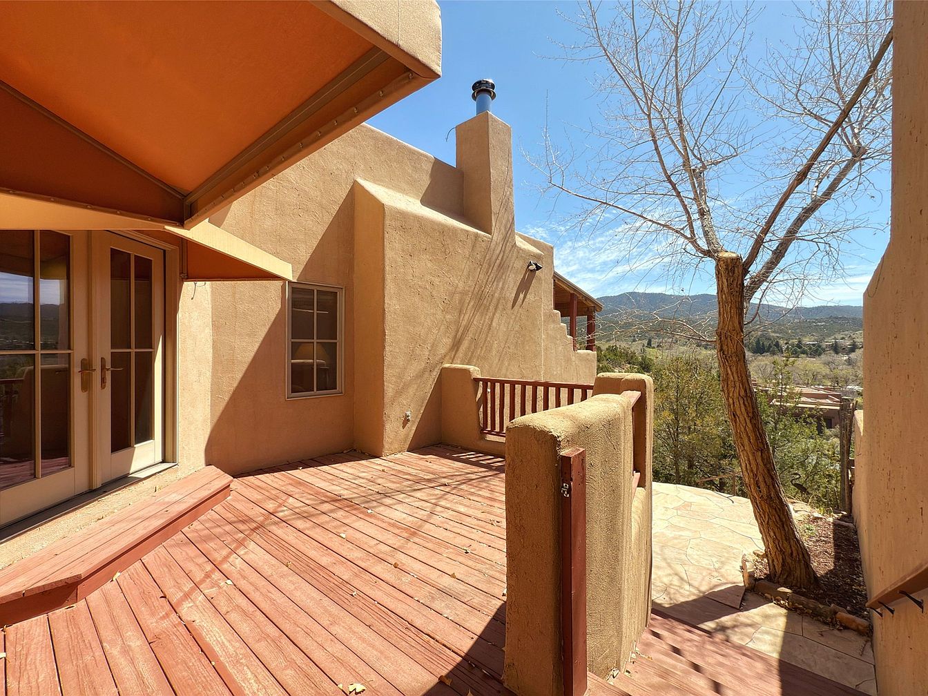 This inviting outdoor patio features a spacious wooden deck, perfect for family gatherings and relaxation. The warm, earthy tones of the stucco walls complement the vibrant orange awning, offering shade and a stylish accent. Comfortable seating can be easily arranged to enjoy views of the surrounding landscape, while the large sliding glass doors provide seamless access to the interior. Architectural details, such as rounded edges and textured surfaces, add character to the space. A mature tree offers additional natural beauty, creating a serene environment ideal for outdoor dining, entertaining, or simply enjoying the picturesque scenery.