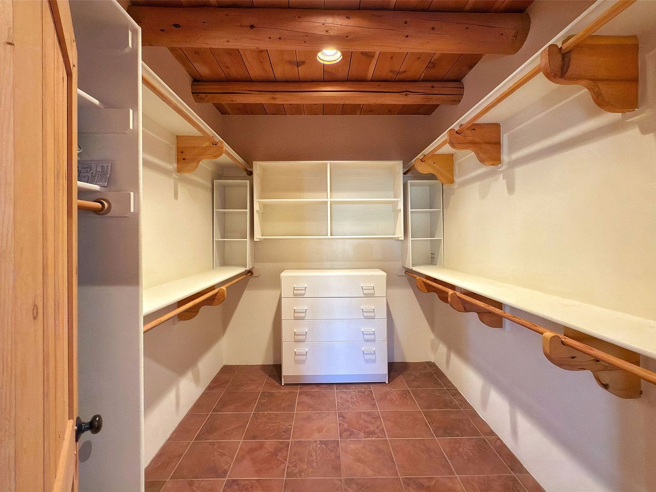 This spacious walk-in closet boasts a functional and airy design, perfect for organized storage and ease of access. Featuring warm wooden beams overhead that add a rustic charm, the room seamlessly combines elegance with practicality. Built-in shelving and a central dresser provide ample space for clothing and accessories, ensuring everything has its place. The earth-toned tile flooring enhances the inviting atmosphere while remaining easy to maintain. A well-planned layout speaks to family-friendly features, making it ideal for busy households. The combination of natural wood elements and soft colors creates a serene retreat for everyday belongings.