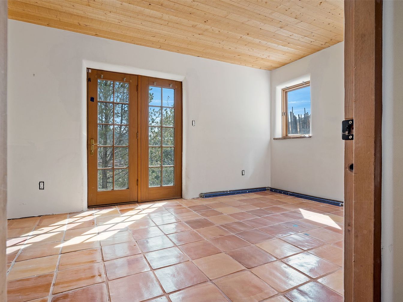 This sunlit entryway features a spacious layout with terracotta tiled flooring that offers both warmth and durability. Large French doors invite natural light, framing picturesque outdoor views and enhancing an open, airy atmosphere. The wooden ceiling with its rich texture adds a rustic charm, harmonizing beautifully with the light-colored walls. A strategically placed window creates a cozy nook that encourages family interaction, perfect for welcoming guests. The simplicity of the design makes it adaptable to various decor styles, while ensuring a comfortable transition space for the home, merging functionality with aesthetic appeal.
