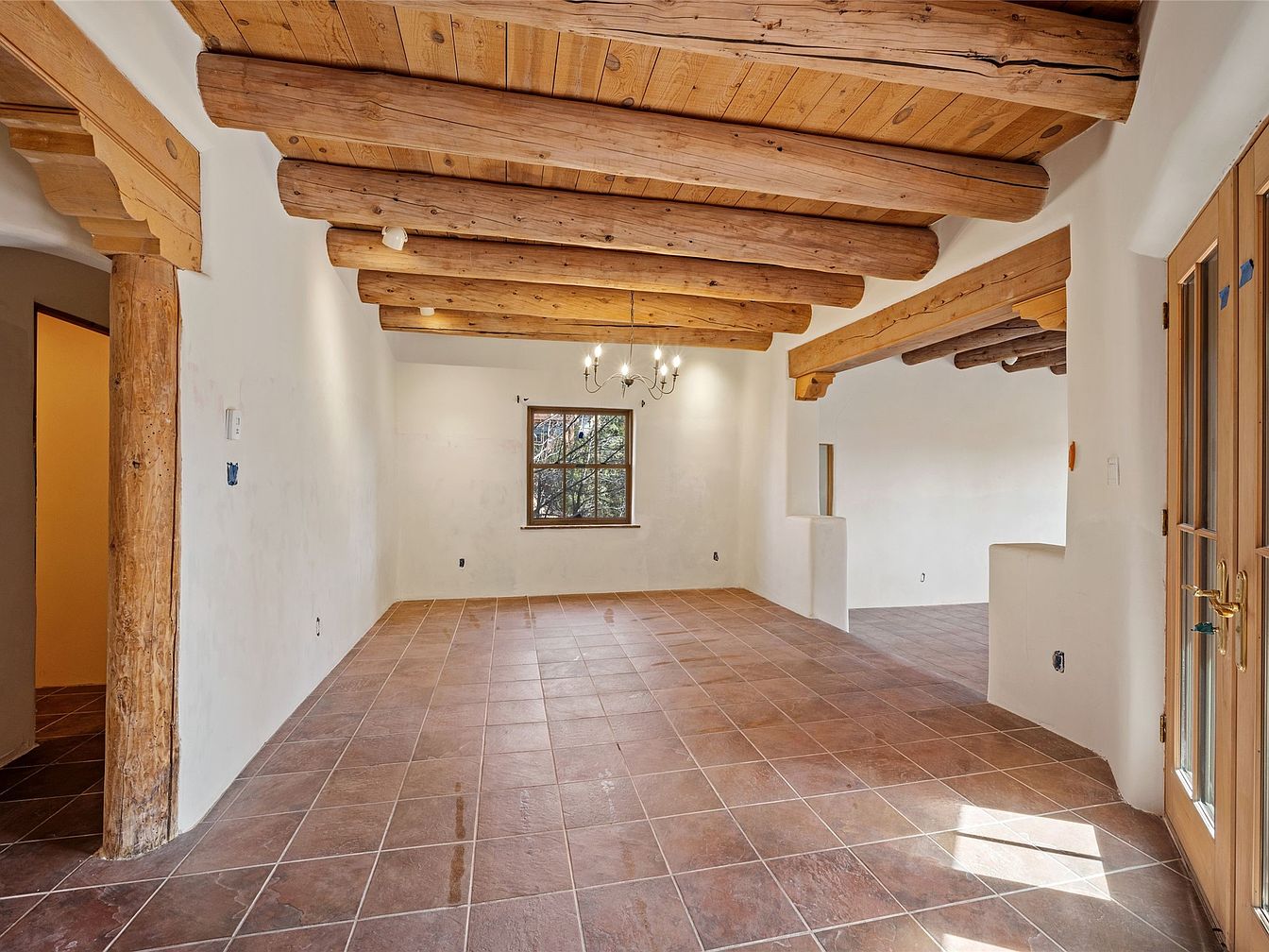 This spacious living room features a captivating blend of rustic charm and modern comfort, highlighted by stunning wooden beams that traverse the ceiling. The warm earth-toned tile flooring offers both durability and a welcoming ambiance, perfect for family gatherings. Freshly painted, the walls provide a clean canvas, ready for personal touches. Large windows and a sliding glass door invite natural light, enhancing the cozy atmosphere. Architectural niches add unique character, while the open layout ensures ample space for both relaxation and entertaining. This inviting room embodies family-friendly design, combining aesthetics with practicality, ideal for creating cherished memories.