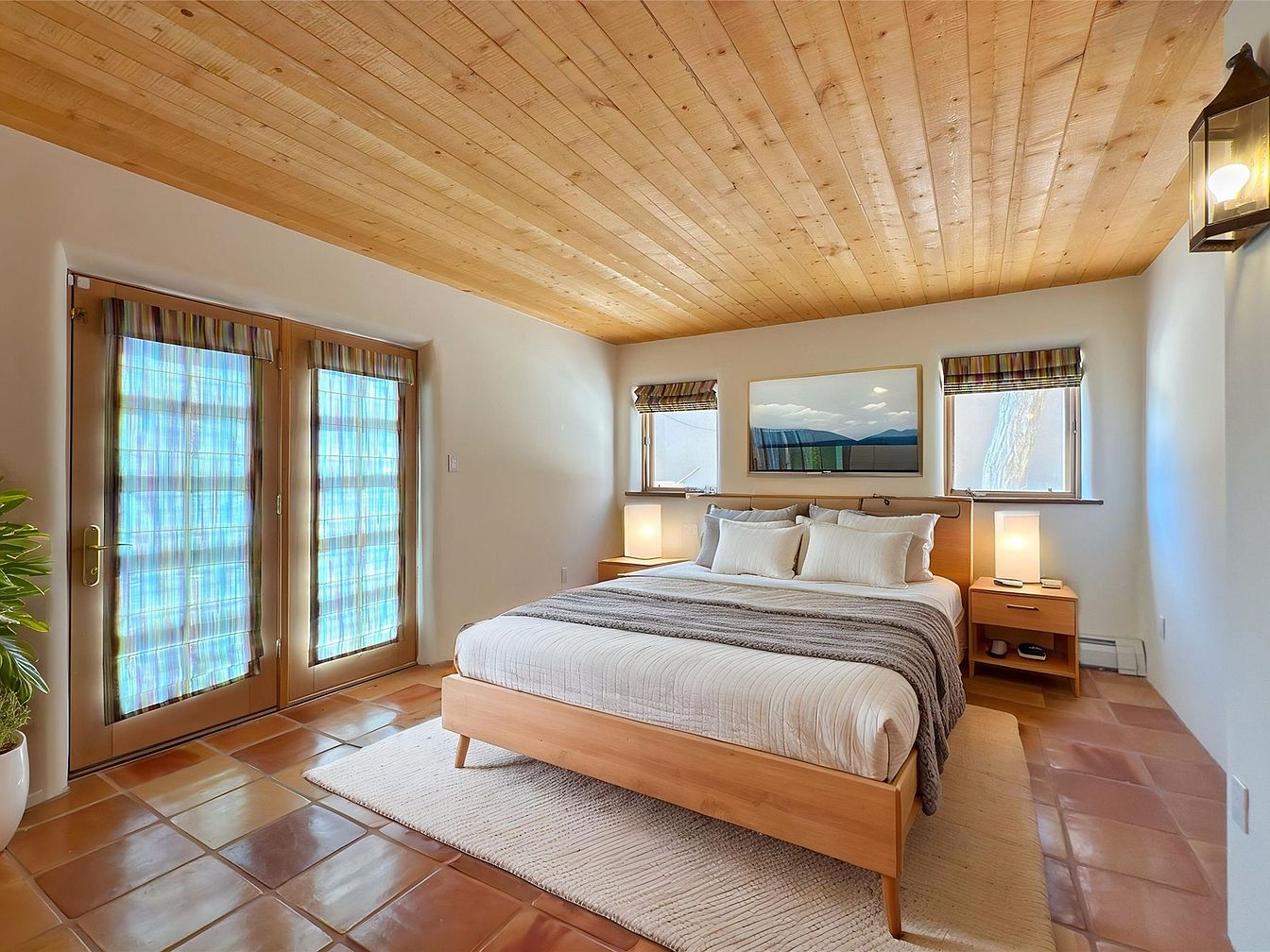 A serene master bedroom features a harmonious blend of comfort and modern design. The natural wood ceiling adds warmth, complementing the terracotta floor tiles that provide a rustic charm. Spacious, light-filled, and family-friendly, the room boasts large windows adorned with soft plaid curtains, allowing ample natural light while maintaining privacy. The stylish bed is centered against the back wall, flanked by sleek nightstands with minimalist lamps, creating an inviting atmosphere. Accents of neutral tones and a cozy throw blanket enhance the relaxed feel, perfectly suited for restful nights and rejuvenating mornings in a tranquil setting.