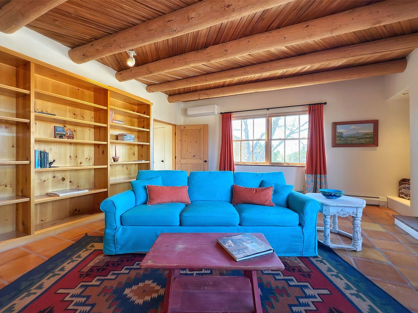 This charming living room features a warm, inviting atmosphere with exposed wooden beams adding rustic character to the ceiling. The bright turquoise sofa, adorned with soft coral accents, serves as a focal point, creating a cheerful contrast against the earthy terracotta flooring. A vibrant area rug enhances the space, infusing it with a touch of cultural flair. Built-in wooden bookshelves offer ample storage and display opportunities, while large windows frame picturesque views and invite natural light. The simple, elegant furnishings, combined with bold textiles and wooden accents, foster a cozy, family-friendly retreat perfect for both relaxation and entertainment.