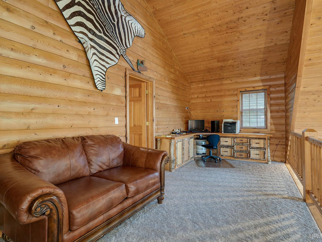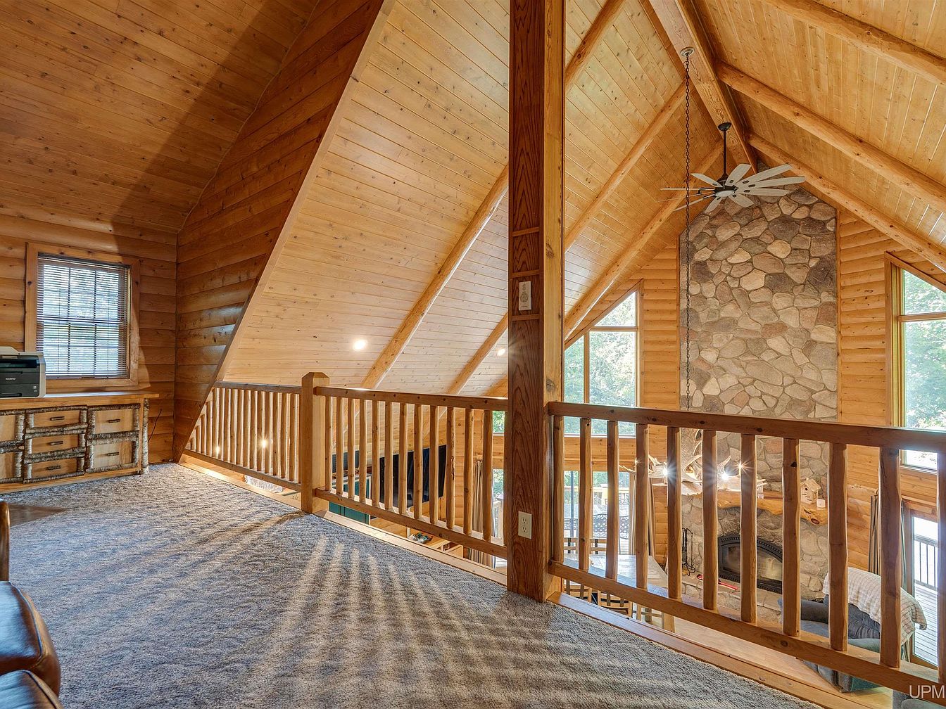 An inviting loft area, characterized by its warm wooden beams and a high vaulted ceiling that emphasizes spaciousness. The rich, natural wood finish creates a cozy atmosphere, complemented by large windows that flood the space with natural light. The stone fireplace serves as a stunning focal point, adding a rustic touch. Plush carpeting underfoot enhances comfort, ideal for family gatherings. The open railing provides a sense of connection to the living area below while maintaining safety. Thoughtfully placed lighting fixtures offer ample illumination, making this space perfect for relaxation or play, establishing a perfect family-friendly ambiance.