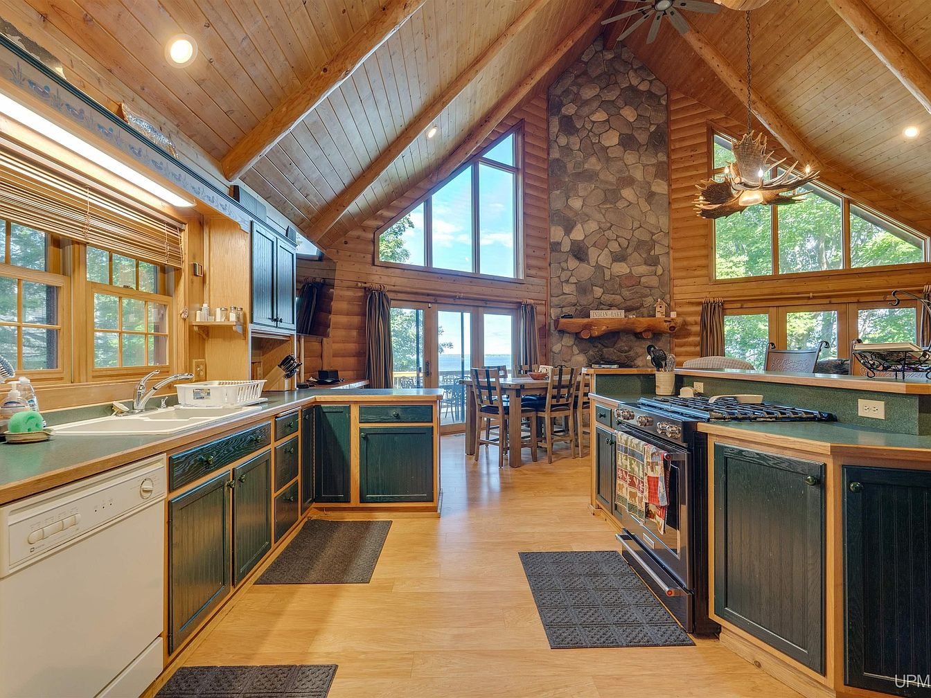 The kitchen showcases a perfect blend of rustic charm and modern convenience, featuring a spacious layout illuminated by abundant natural light from large, strategically placed windows. Warm wooden cabinetry, accented in rich green, complements the light honey-toned flooring, enhancing the room’s inviting atmosphere. A central island serves as a multi-functional workspace, perfect for family gatherings or casual meals. The stone fireplace stands as a stunning focal point, adorned with a handcrafted mantle. Practical amenities, such as a dishwasher and ample counter space, ensure functionality, while the cozy dining area connected to the kitchen invites memorable moments with loved ones.