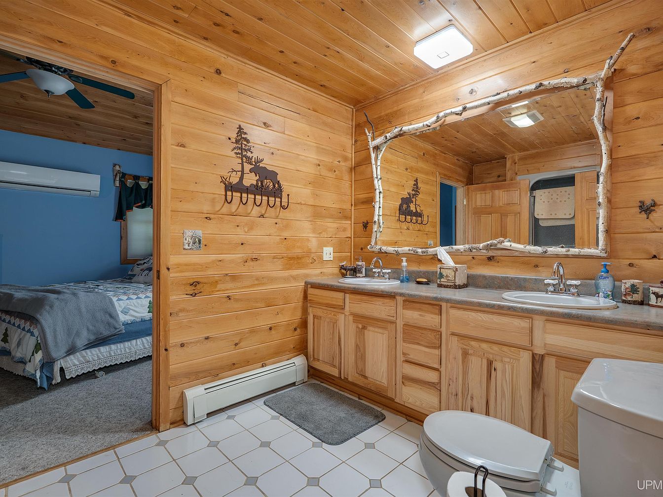 This inviting bathroom features rich wooden paneling that creates a warm and rustic ambiance. The dual sink vanity showcases beautifully crafted wood cabinetry and a charming mirror framed with natural birch branches, enhancing the outdoorsy feel. Expansive tile flooring, with a subtle hexagonal pattern, complements the earthy tones, while soft lighting fixtures add a touch of warmth. Family-friendly amenities include ample counter space for toiletries and a convenient storage area. The adjoining bedroom, glimpsed through the open doorway, features cozy carpeting and cheerful blue accents, providing a seamless flow between spaces, ideal for comfort and relaxation.
