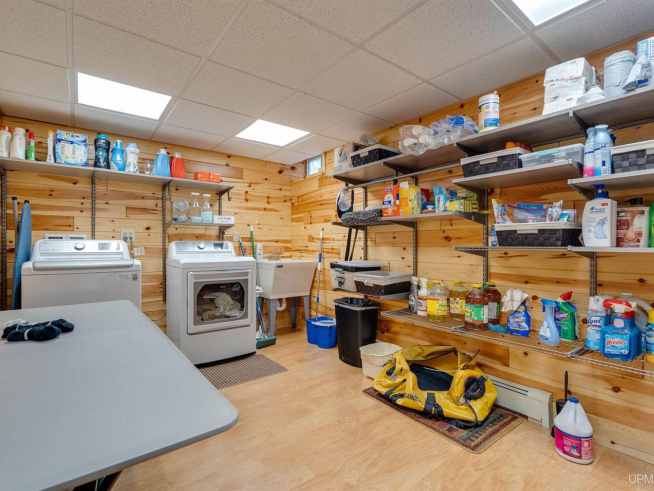 Efficient and organized, this laundry room features wooden paneled walls that lend a warm, rustic charm. The layout incorporates two modern washing machines strategically placed for optimal workflow. Above, shelves neatly display laundry detergents and supplies, ensuring everything is within easy reach. A deep sink adds functionality for hand-washing or rinsing delicate items. The light, neutral color palette is complemented by the natural wood tones, creating a soothing atmosphere. Practical elements, like a folding table, provide essential workspace, while spacious storage solutions maintain order. Bright lighting enhances the room’s inviting feel, making chores a more pleasant experience.