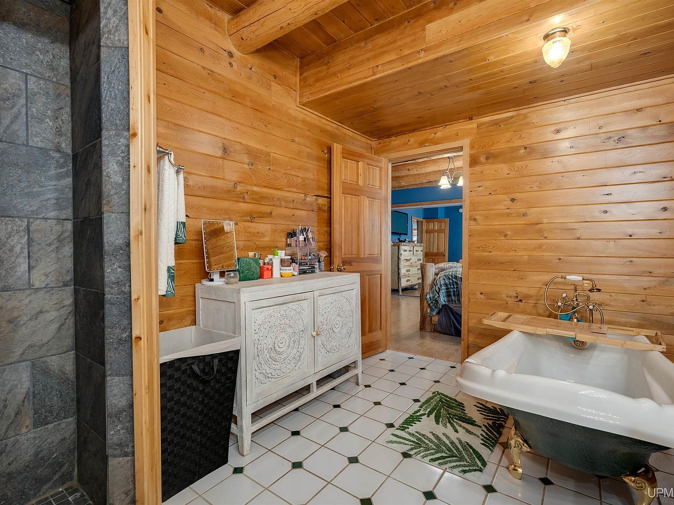This rustic bathroom exudes warmth and charm with its wood-paneled walls and ceiling beams, creating a cozy atmosphere. A luxurious freestanding bathtub with a vintage gold faucet sits prominently, complemented by a tasteful bamboo tray for convenience. The layout includes a dual vanity with elegant fixtures and a nearby spacious shower, offering family-friendly functionality. The contrast between the light wood tones and the darker tiled shower adds depth, while the green and white accents in the towels and bath mats evoke a serene, nature-inspired feel. Ambient lighting enhances the inviting space, perfect for relaxation.