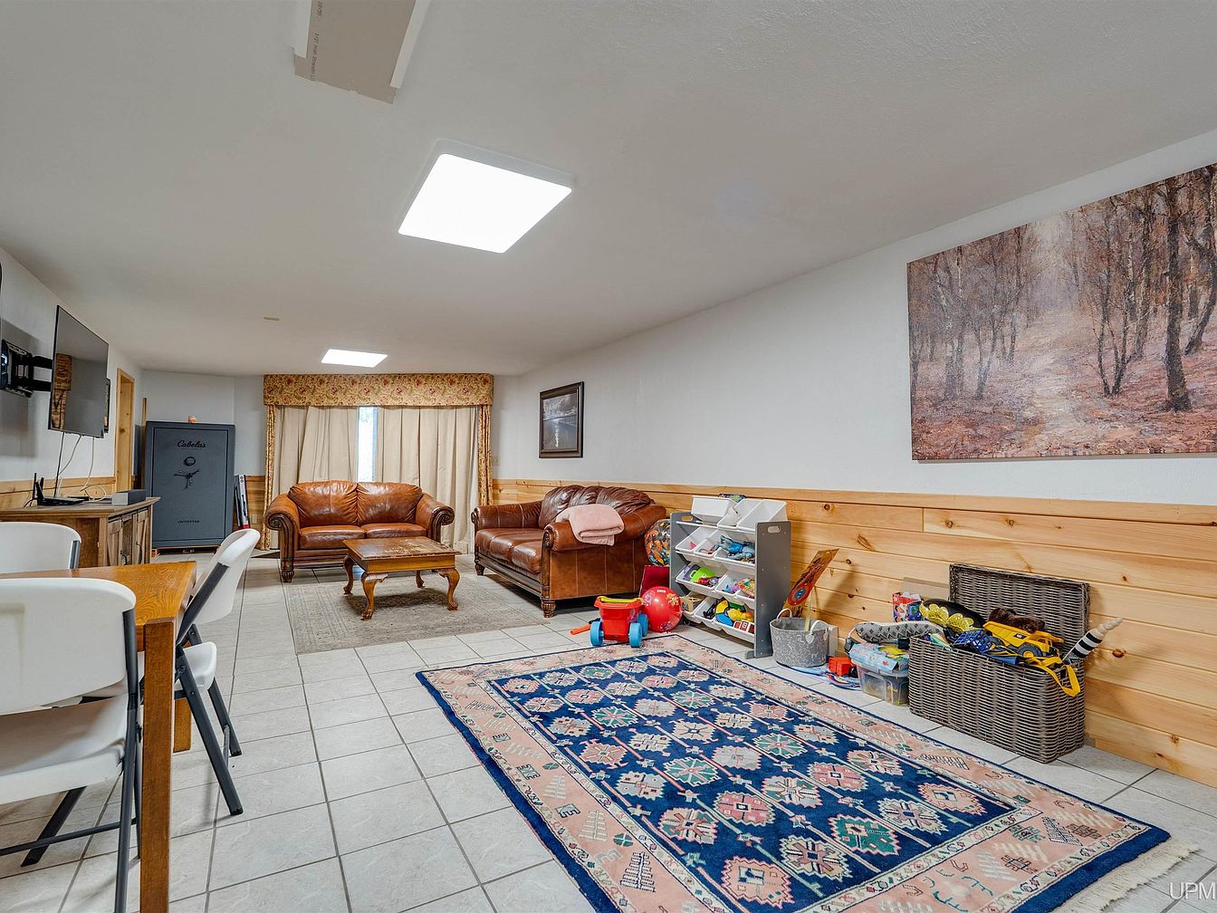 A welcoming family room blends comfort and functionality, featuring rich leather sofas and a central coffee table that invites relaxation. Natural light pours in through skylights, enhancing the airy atmosphere. The room showcases a warm color palette with wooden accents, like the paneling, which creates a cozy ambiance. Tile flooring offers durability, perfect for family life, while a vibrant area rug adds a pop of color. A well-placed entertainment center provides a perfect spot for movie nights, and toy storage keeps the space organized, making it ideal for family gatherings and playdates.