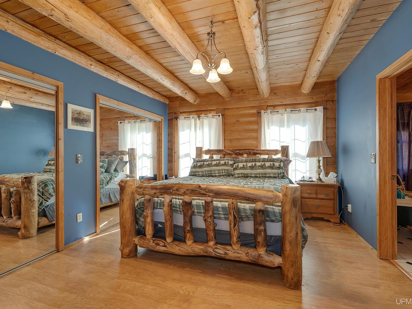 This master bedroom showcases a perfect blend of rustic charm and modern comfort. The space features warm wooden beams overhead, enhancing its cozy ambiance. The walls are adorned in a calming blue, providing a serene contrast to the natural wood. A luxurious log bed, dressed in layered bedding with nature-inspired patterns, invites relaxation. Large windows draped in soft, light curtains flood the room with natural light, making it feel spacious and airy. Mirrored wardrobes add functionality while amplifying light, and a tasteful nightstand with a classic lamp adds a touch of elegance. Ideal for family living.