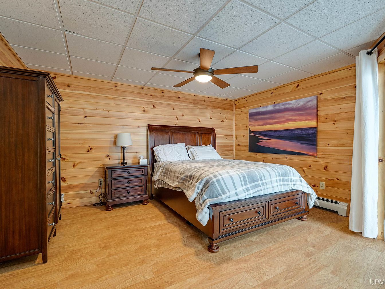 This master bedroom blends rustic charm with modern comfort, featuring stunning wooden paneling that adds warmth and texture to the space. The large bed, adorned with a cozy plaid blanket, offers an inviting focal point. Adjacent to the bed, matching nightstands with stylish lamps provide convenience and functionality. A tall dresser complements the furniture ensemble, enhancing storage solutions while maintaining aesthetic balance. The soft color palette promotes tranquility, accented by the beautiful sunset painting that brings a touch of nature indoors. Natural light floods the room through the window draped with light curtains, creating a peaceful retreat for relaxation.