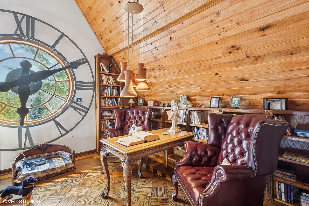 This charming home office combines rustic elegance with functionality, characterized by its striking vaulted wooden ceiling and rich wood-paneled walls. Central to the room is a beautifully crafted wooden desk adorned with an open book, flanked by two luxurious burgundy leather armchairs that invite comfort and productivity. A large clock window serves as a dramatic focal point, filling the space with natural light while offering serene views of the outdoors. Sleek pendant lighting adds a modern touch, illuminating a cozy reading nook with a dog bed, making it a perfect blend of work and relaxation.