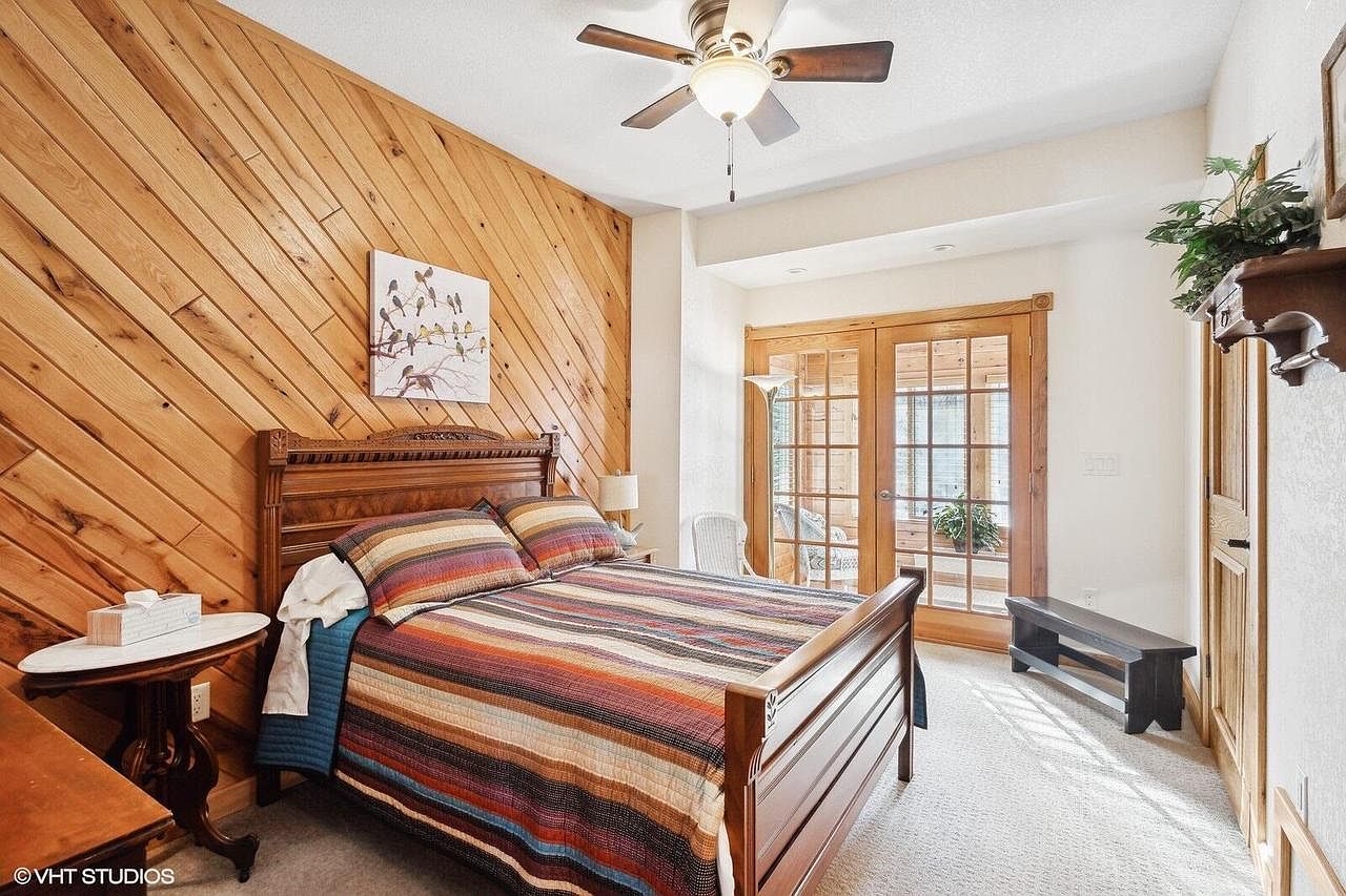 This inviting master bedroom combines rustic charm with modern comfort. The feature wall showcases beautiful wood paneling, adding warmth and a cozy cabin feel. A sophisticated wooden bed frame complements the vibrant striped bedding, which introduces rich colors of red, blue, and cream to the space. A soft carpet underfoot enhances comfort, creating a welcoming atmosphere. Natural light floods in through the glass French doors, leading to a serene sunroom, perfect for relaxation. Thoughtful details like bedside tables with lamps and a minimalist bench add functionality, making this room an ideal retreat for both relaxation and family gatherings.