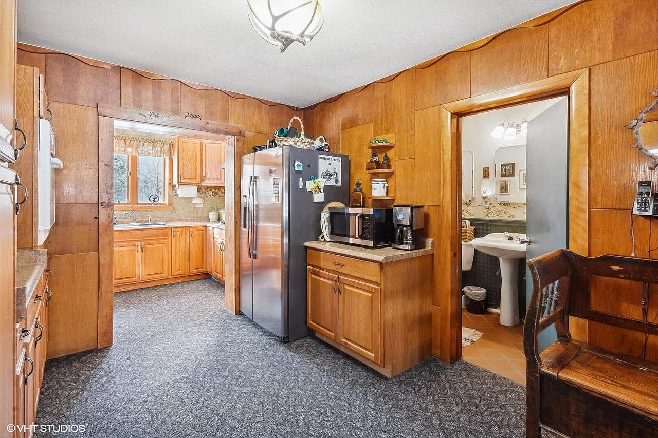 This inviting kitchen blends rustic charm with practical design. Warm wood paneling and cabinetry create a welcoming atmosphere, complemented by a textured gray carpet revealing a subtle pattern. Natural light pours in through a charming window above the sink, enhancing the cozy feel. The kitchen is equipped with modern stainless-steel appliances, including a side-by-side refrigerator and sleek countertop microwave, ensuring convenience for family gatherings. Decorative shelves showcase personal touches, while an antique chair adds character. The adjacent doorway hints at easy access to additional spaces, ensuring this kitchen is both functional and family-friendly.