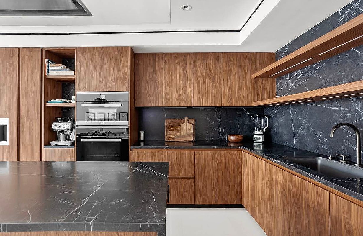 A stunning modern kitchen featuring rich dark wood cabinetry paired with striking black marble countertops, creating a sophisticated, yet warm atmosphere. The open layout provides a spacious feel, perfect for family gatherings. Sleek, built-in appliances enhance convenience, including a stylish coffee machine and an integrated oven, seamlessly blending functionality with design. The minimalist shelves showcase curated books and décor items, adding a personal touch. Understated, elegant fixtures in matte black complement the overall aesthetic, while the smooth surfaces and clean lines contribute to a contemporary vibe. Ideal for culinary adventures or casual family dining.